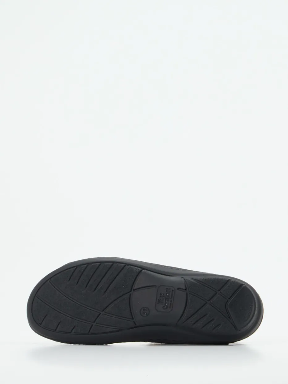 Für lange Tage auf den Beinen bieten die ergonomisch geformten Sandalen in schwarzem Nubukleder samtig-angeschliffene Oberflächen, ein lederbezogenes, auswechselbares Korkfußbett und zwei individuell verstellbare Klettverschlüsse. Silberfarbene Strassapplikationen auf dem Blatt sorgen für einen dezent modischen Akzent. Die flexible PU-Sohle mit rutschhemmendem Profil und leichtem Absatz stabilisiert bei jedem Schritt. Minimalistische Linienführung trifft Quiet-Luxury-Ästhetik mit Wohlfühlcharakter – ideal für Freizeit oder zu Hause. Kombiniert mit Leinenhose oder Maxi-Rock ergibt sich ein stilvoller, komfortorientierter Sommerlook.