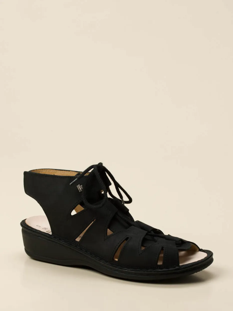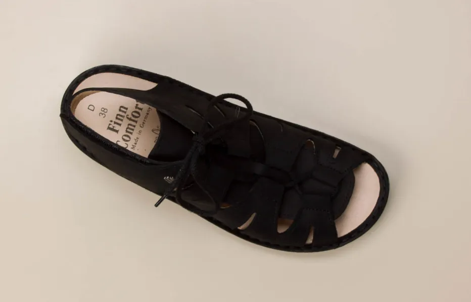Wohlfühlen bei jedem Schritt.Finn Comfort präsentiert bequeme Komfortsandalen für Damen. Im Alltag oder bei langen Spaziergängen bieten diese schwarzen Sandalen gesunden Halt und angenehmen Tragekomfort. Das samtig angeschliffene Nubukleder verbindet sich mit einer gepolsterten Innensohle und austauschbarem Fußbett zu einem funktionalen Ganzen. Die geschlossene Form mit seitlichen Cut-Outs und die praktische Schnürung runden das casual Design ab. Dezente Ton-in-Ton-Nähte und ein kleines Metalllogo unterstreichen die Zurückhaltung des Looks. Der modische Minimalismus orientiert sich am Komforttrend der Saison und passt hervorragend zu entspannten Outfits. Orthopädisch sinnvoll gedacht, hochwertig verarbeitet – Finn Comfort steht für langlebige Qualität Made in Germany.