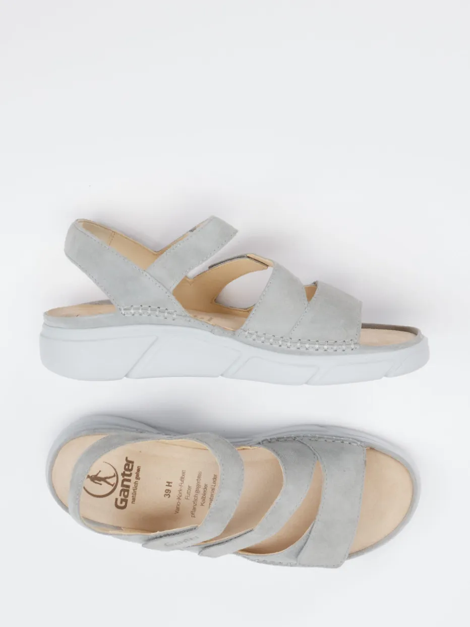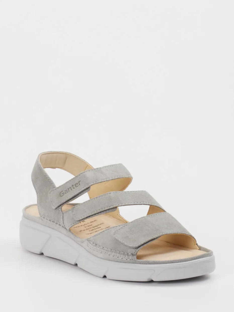 Komfort für entspannte Sommertage. Ganter präsentiert mit dieser Damen-Komfortsandale ein Modell, das durch Funktionalität und dezente Ästhetik überzeugt. Ob beim Spaziergang oder in entspannter Freizeitgestaltung – das weiche Veloursleder sorgt zusammen mit der gepolsterten Decksohle für ein angenehmes Tragegefühl. Die hellgraue Farbgebung unterstreicht die minimalistische Optik, während Ton-in-Ton-Nähte, eine dezente Prägung und die offene, ergonomisch geformte Silhouette für zurückhaltende Eleganz stehen. Die dreifach verstellbaren Klettverschlüsse ermöglichen eine individuelle Passform, die leichte PU-Sohle bietet Sicherheit bei jedem Schritt. Ideal kombinierbar zu hellen Leinenhosen oder lässigen Sommerkleidern. Ganter vereint orthopädisch inspirierten Komfort mit zeitgemäßem Design.