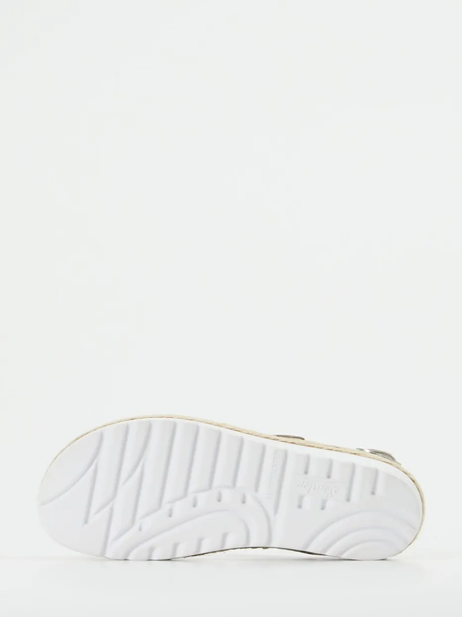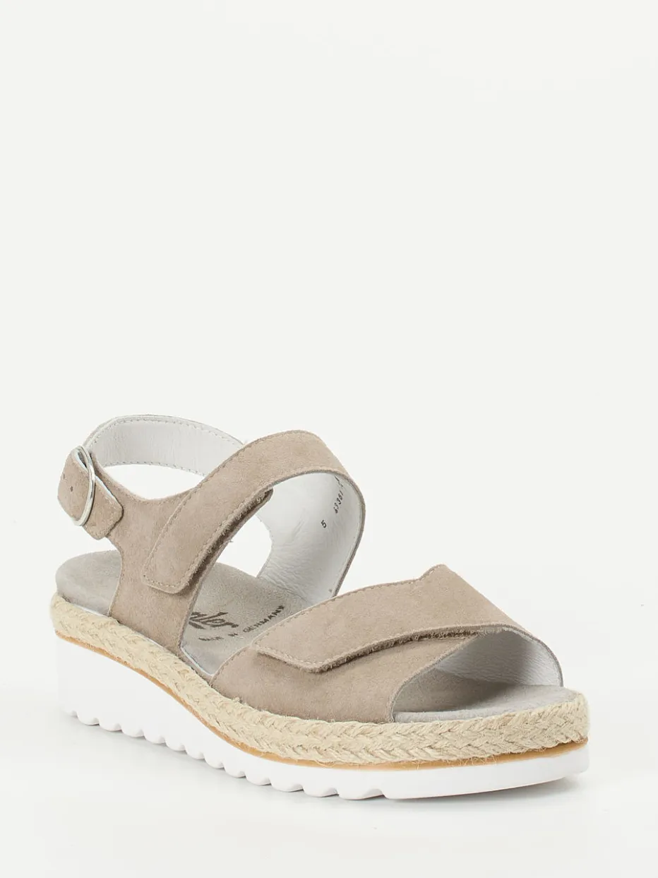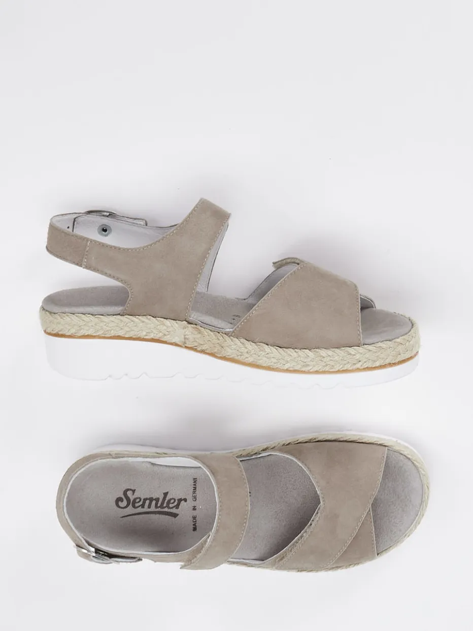 Stilvoll komfortabel durch den Sommer.Die Komfortsandale von Semler bringt mit ihrer ergonomischen Form und hochwertigen Verarbeitung ehrlichen Komfort in die Freizeitgarderobe. Ideal für warme Tage, überzeugt das Modell aus feinem Kalbleder in Veloursqualität – matt angeschliffen für eine dezente Textur. Die taupefarbene Optik in Kombination mit dem beigen Jute-Einsatz an der Sohle setzt auf Natürlichkeit. Zwei Klettverschlüsse und ein Fersenriemen mit silberfarbener Schnalle sorgen für passgenauen Sitz, während die weiße PU-Sohle rutschfest und flexibel ist. In Weite H und mit herausnehmbarem Fußbett ist die Sandale auch orthopädisch durchdacht. Lässt sich mühelos mit Leinenhose oder Sommerrock kombinieren. Nachhaltiger Komfort für entspannte Sommertage – made by Semler.