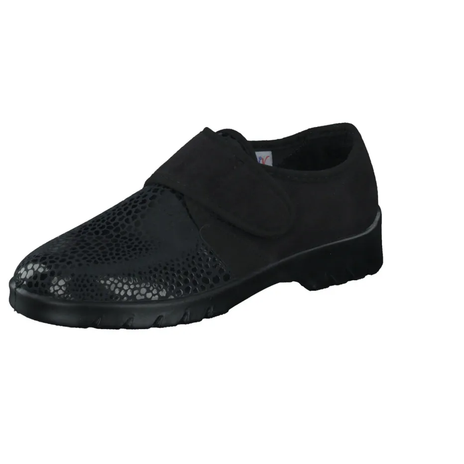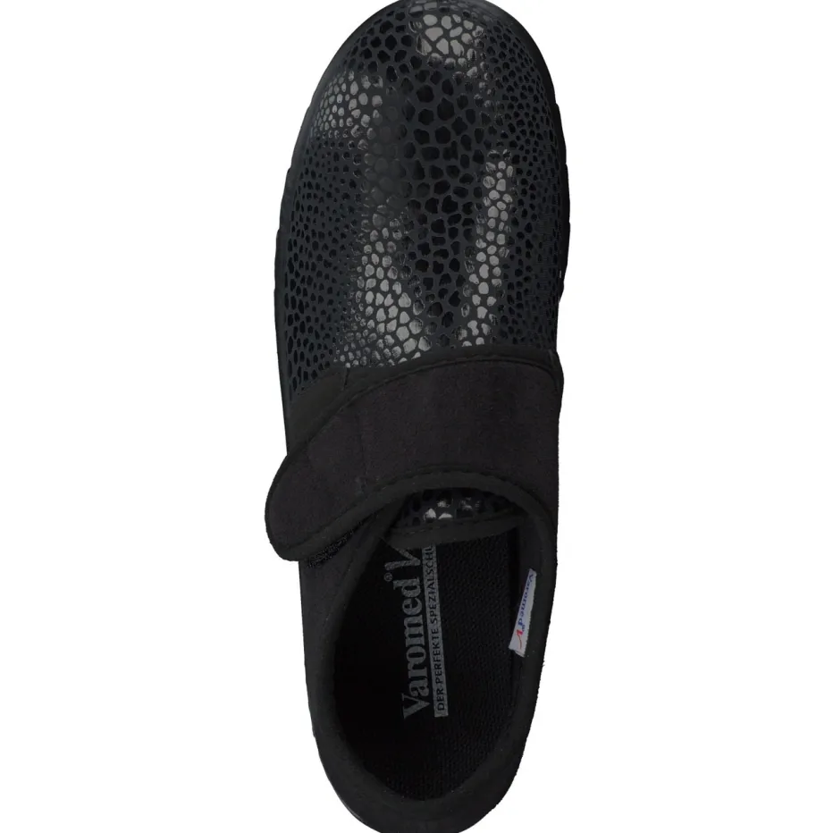 Praktischer Komfort mit Stilgefühl.Der Damen-Komfortschuh von Varomed überzeugt durch seine gelungene Balance aus Funktion und Design. Ideal für entspannte Alltagssituationen, bietet das Modell mit flexiblem Stretchtextil und glänzender Reptilprägung im Vorderfußbereich sowohl Komfort als auch visuelle Raffinesse. Seine klassische runde Form, der praktische Ton-in-Ton Klettverschluss und eine rutschhemmende PU-Profilsohle erhöhen den Tragekomfort im Haus oder bei kurzen Wegen. Die schwarze Farbgebung mit Strukturwechsel unterstreicht den minimalistischen Anspruch und ermöglicht vielseitige Kombinationen – besonders passend zu legerer Loungewear oder bequemer Freizeitkleidung. Die Varomed-Komfortpassform bietet spürbaren Wohlfühlfaktor für empfindliche Füße.