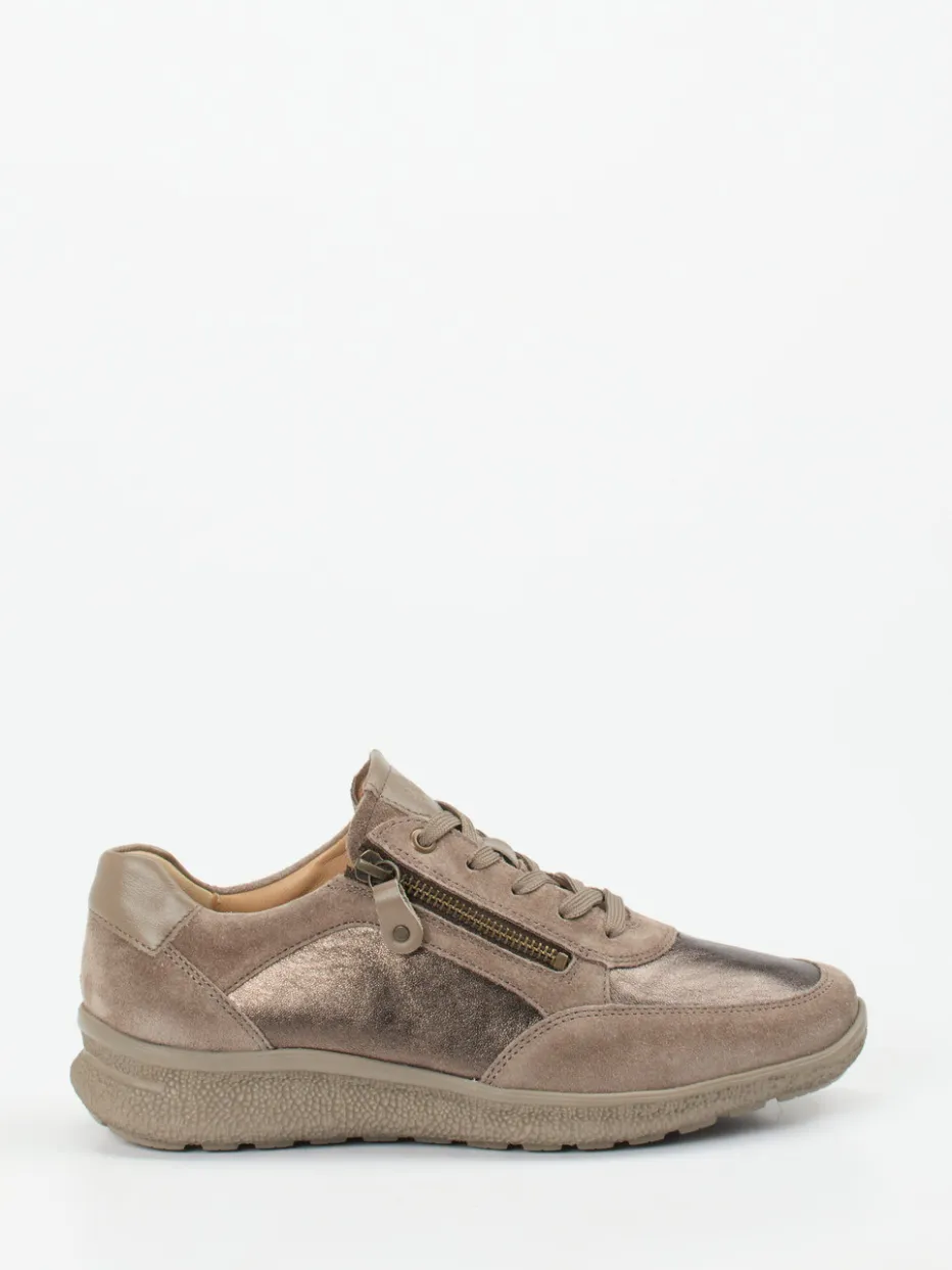 Komfort trifft auf dezente Eleganz.Hartjes präsentiert mit diesem Komfortsneaker ein Modell für Damen, das sich ideal in den entspannten Alltag einfügt. Ob beim Stadtbummel oder entspannten Spaziergang – dieser Schuh schafft mühelos den Spagat zwischen Bequemlichkeit und Ästhetik. Das samtig angeschliffene Veloursleder in Taupe wird durch changierende Metallic-Einsätze stilvoll kontrastiert. Klassisch-runde Form und bronzefarbener Reißverschluss unterstreichen das durchdachte Design. Weich gepolsterter Einstieg und rutschhemmende Gummisohle fördern Tragekomfort ebenso wie modische Ruhe. Inspiriert vom Trend „Quiet Comfort“ passt dieser Sneaker ideal zu Naturtönen, Strick und Kaschmir. Maximaler Laufkomfort im urbanen Stil – typisch Hartjes.