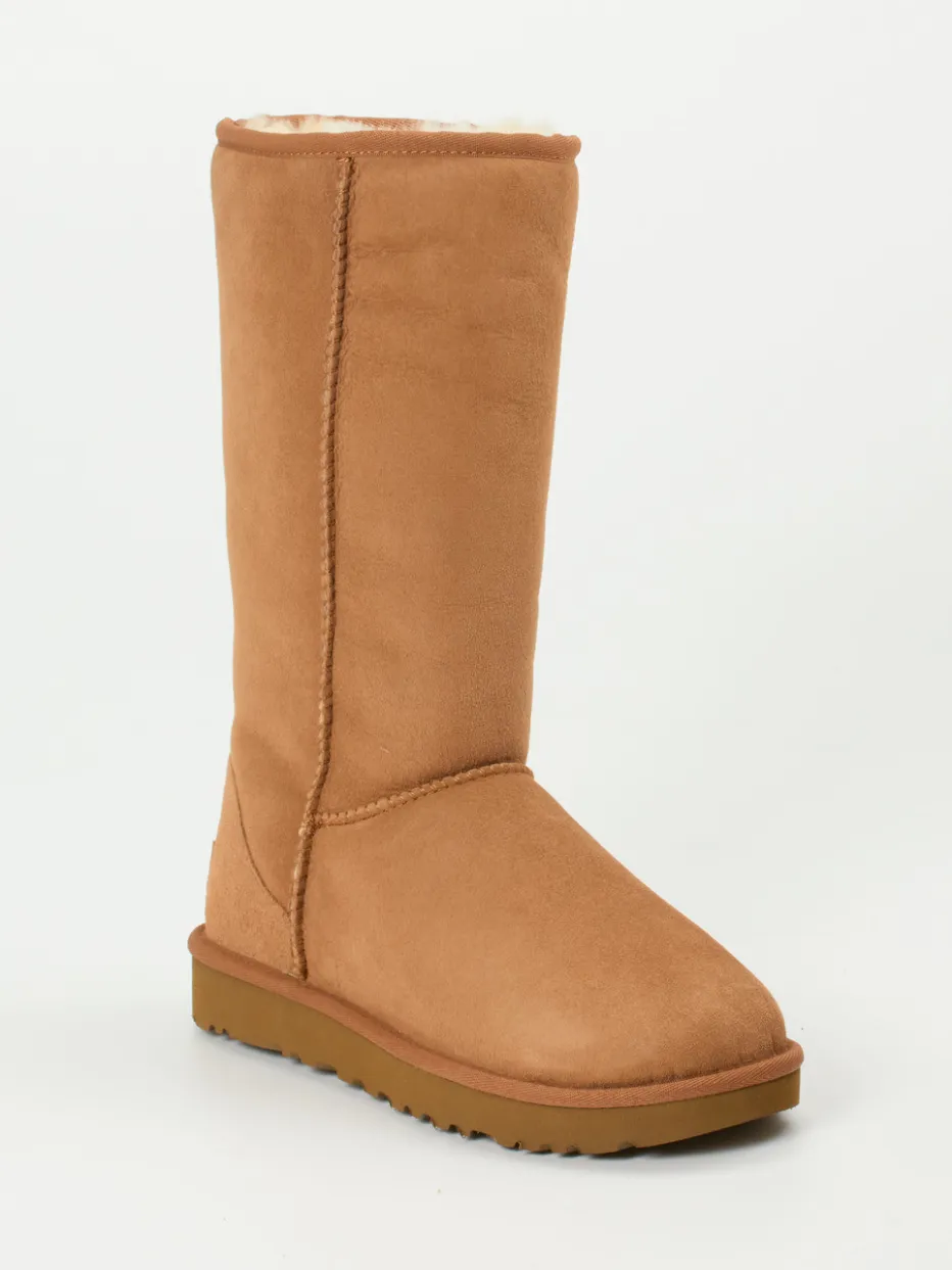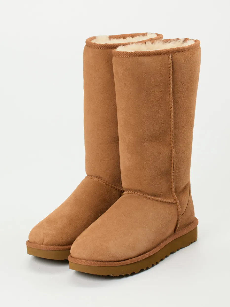 Ein hochwertiger Winter-Boot von UGG mit charakteristischer Cognacnuance, echtem Lammfellfutter und rutschfester Gummisohle – stilvoller Komfort trifft skandinavische Schlichtheit.