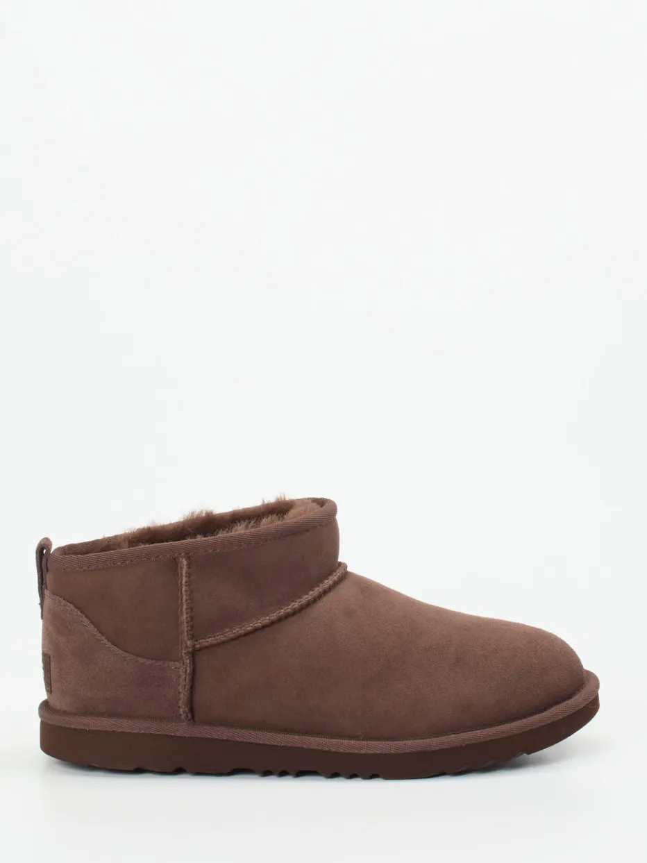 Wärme trifft auf Lässigkeit.UGG präsentiert eine hochwertige Unisex-Stiefelette aus der Kategorie Lammfell-Boots. Ideal für entspannte Tage daheim oder lockere Freizeit-Looks: Das schokobraune Veloursleder mit mattierter Oberfläche verleiht dem klassischen Modell seine edel-robuste Ausstrahlung. Das echte, weich wärmende Lammfellfutter sorgt für ein rundum behagliches Tragegefühl. Die knöchelhohe, rund geschnittene Silhouette mit Zuglasche erleichtert den Einstieg, während eine markant profilierte Sohle sicheren Halt auf winterlichen Böden gibt. Dezente Ton-in-Ton-Nähte und geprägte Logos an Ferse und Sohle unterstreichen den cleanen Look im Stil der „Quiet Luxury“-Ästhetik. Ein komfortorientierter Style, wie gemacht für kühle Tage mit Anspruch.