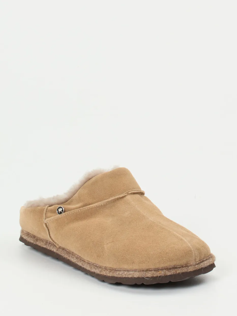 Das samtig angeschliffene Veloursleder in sandbeiger Nuance ergänzt sich ideal mit dem soften, geruchsneutralisierenden Lammfellfutter. Die offene Ferse sorgt für müheloses Hineinschlüpfen, während die strukturierte EVA-Sohle rutschfeste Sicherheit bietet – auch auf glatten Böden. Ton-in-Ton-Nähte und ein seitlicher Metallknopf unterstreichen den zurückhaltenden Look im Scandi-Stil. Ideal zu Loungewear oder Wollsocken.