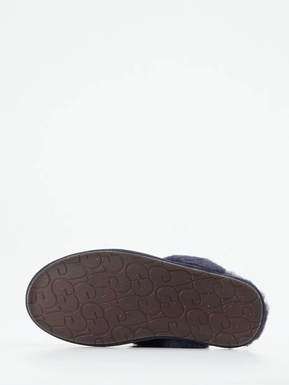 Das dunkelblaue Veloursleder mit matter Oberfläche ist weich angeschliffen und ergibt in Kombination mit dem warmen Lammfellfutter ein behagliches Tragegefühl – ideal für kühle Tage. Die offene Fersenpartie in Schlupfform, die Ton-in-Ton-Nähte und die geprägte Logo-Seite unterstreichen den dezenten Look. Der Gummikork-Mix an der Sohle macht dieses Modell sogar outdoor-tauglich. Inspiriert von Hygge und Shearling-Trends der Saison, passt es perfekt zu entspannten Loungewear-Styles oder Fleece-Outfits.