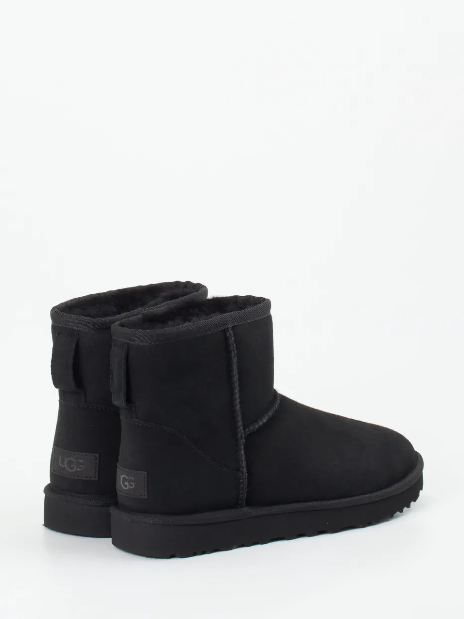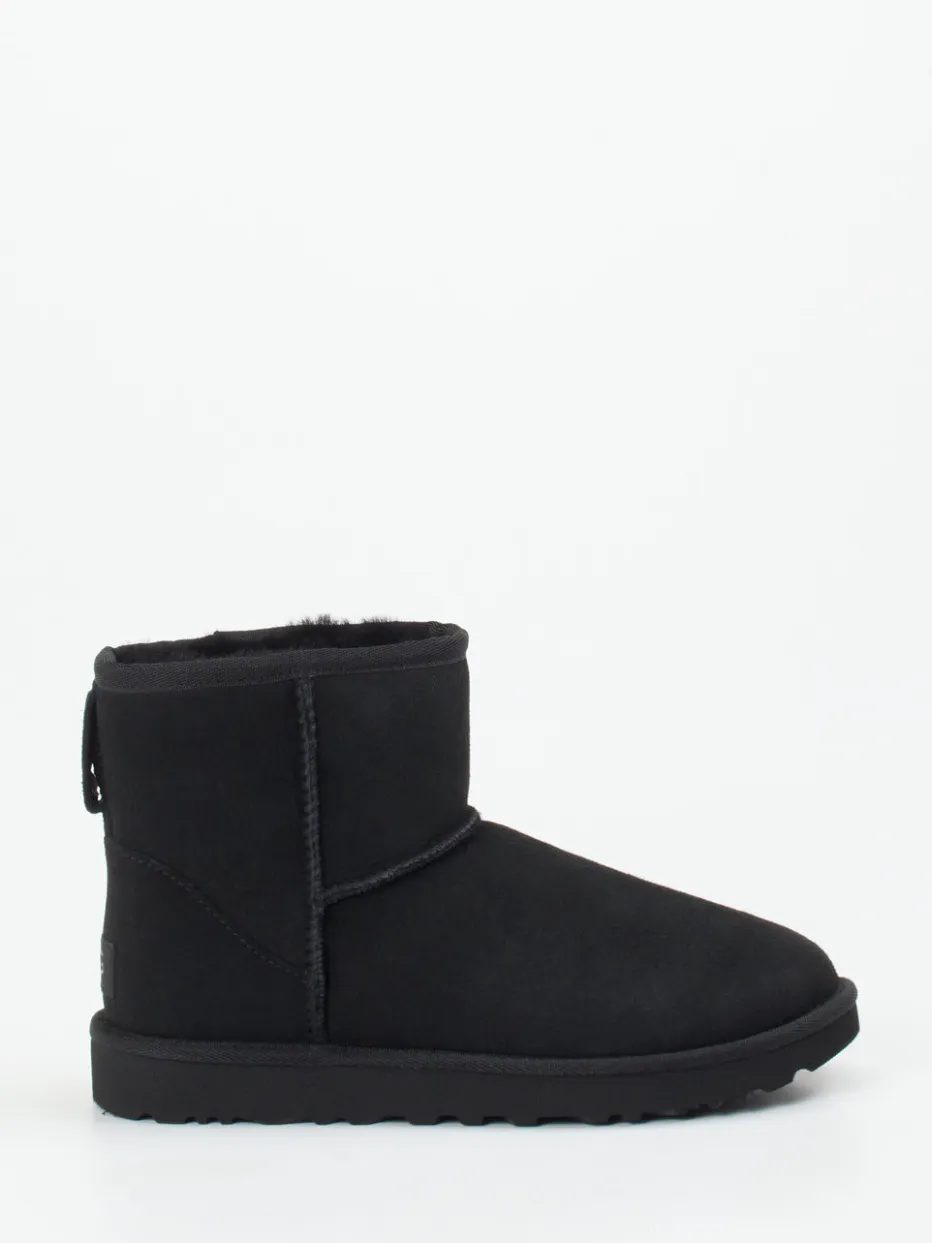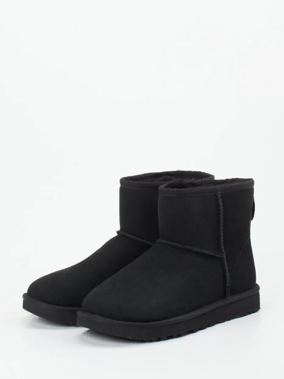 Winterklassiker mit Komfortfaktor.Die Marke UGG präsentiert hier eine Damen-Stiefelette für die kalte Jahreszeit. Dank weichem Veloursleder mit samtig-matter Oberfläche und kuscheligem Lammfellfutter bietet das Modell verlässliche Wärme an frostigen Tagen. In tiefem Schwarz gehalten, zeigt sich die knöchelhohe, klassisch gerundete Silhouette mit sauber gearbeiteten Ton-in-Ton-Nähten und einem Logo-Patch an der Ferse. Die bequeme Schlupfform mit Zuglasche erlaubt ein unkompliziertes Anziehen, während die profilierte Gummisohle für Trittsicherheit sorgt. Der minimalistische Look passt zur Cozy-Winterwear und ergänzt sowohl entspannte Home-Outfits als auch lässige Streetstyle-Kombis. Ein Wohlfühl-Boot mit typischer UGG-DNA und hohem Tragekomfort.