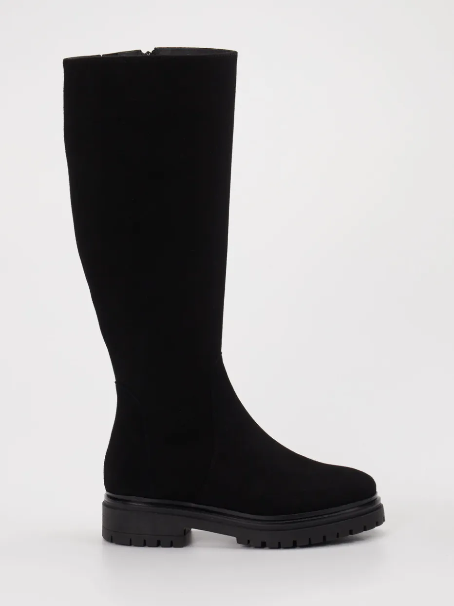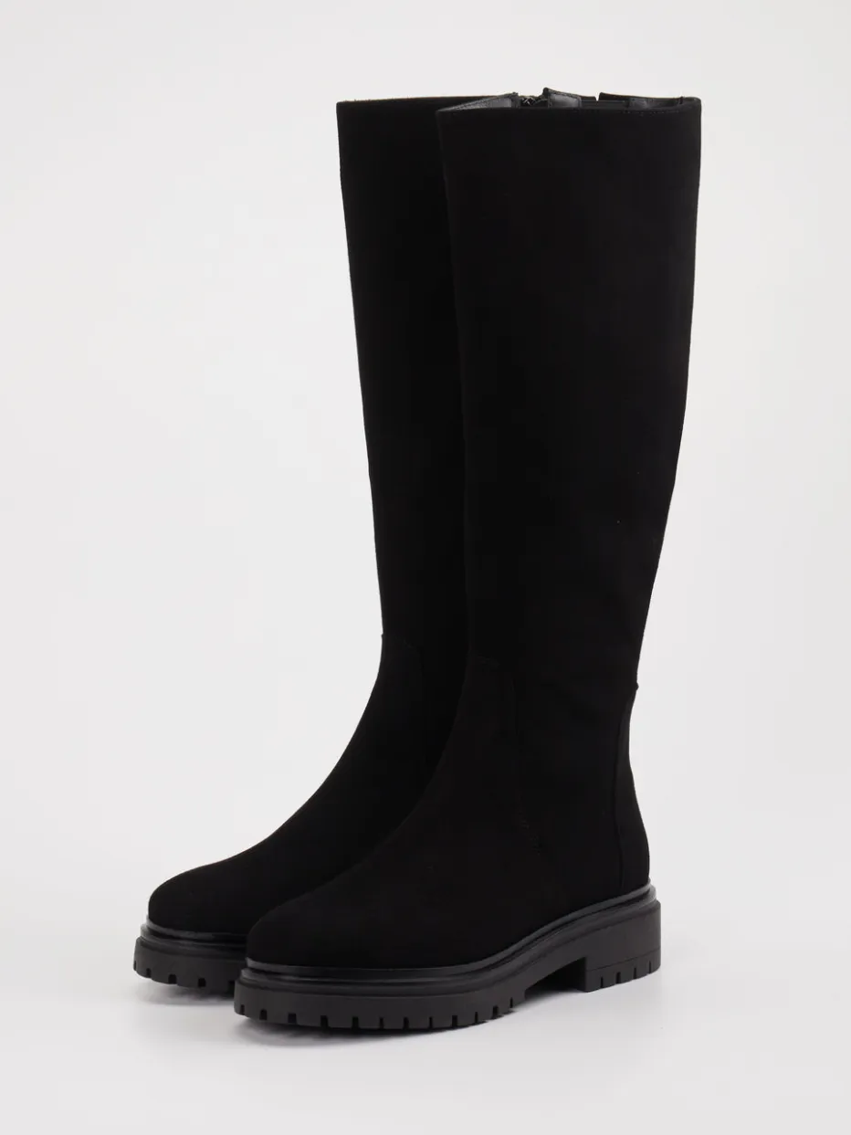 Klare Linien und matte Samthaptik prägen diesen femininen Langschaftstiefel mit robuster Profilsohle – perfekt für minimalistische Looks im urbanen Herbst-Winter.