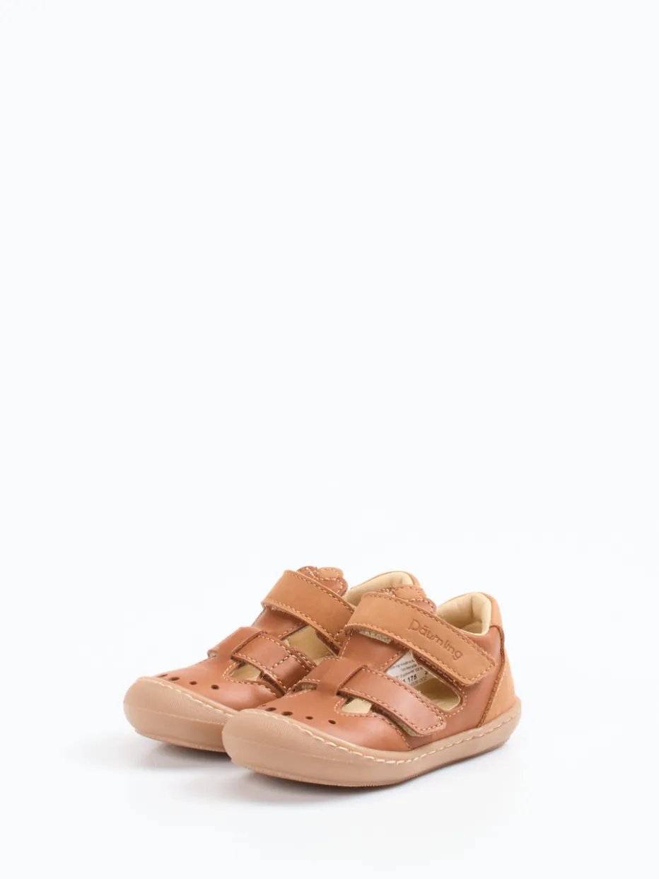 Ideal für Alltag und Freizeit: Die geschlossene Zehenpartie schützt kleine Füße zuverlässig, während die doppelt verstellbaren Klettverschlüsse für festen Halt sorgen. Das matte Naturleder in einem warmen Cognacbraun wird durch feine Kontrastnähte und ein geprägtes Markenlogo betont. Die ergonomisch geformte Gummisohle bietet rutschfesten Stand bei ersten Gehversuchen. Inspiriert vom skandinavischen Minimalismus fügt sich das Design nahtlos in die „Slow Fashion Kids“-Linie ein. Kombiniert mit Naturstrümpfen entsteht ein rundum harmonischer Look.