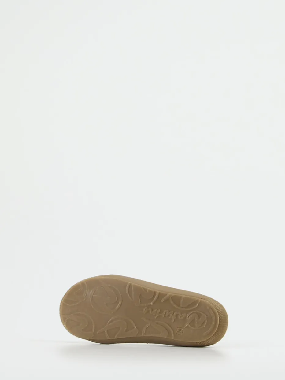 Ideal für erste Gehversuche: Das weiche Kalbleder bietet in Verbindung mit dem beigen Farbton und der matten Oberfläche eine dezente, hochwertige Optik. Die klassische, runde Form mit robuster Schnürung über Metallösen und einer verstärkten Zehenkappe sorgt für guten Sitz und Schutz. Innen überzeugt das Modell mit ledergefüttertem Komfort und einem weich gepolsterten, austauschbaren Fußbett. Die rutschhemmende honigfarbene Gummisohle ergänzt das funktionale Design. Ton-in-Ton-Nähte und ein geprägtes Seitenlogo runden den reduzierten Look ab.