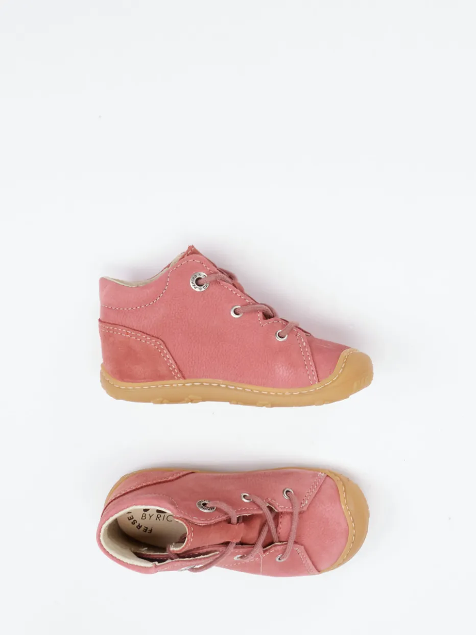 Weicher Halt für kleine Schritte.Ricosta zeigt mit diesem flexiblen Lauflernschuh ein Modell, das speziell für Laufanfänger entwickelt wurde. Altrosafarbenes Nubukleder mit samtiger Oberfläche und strukturierter Genarbtheit bildet die hochwertige Basis des knöchelhohen Designs. Die weich-flexible Gummisohle unterstützt natürliche Bewegungen und sorgt mit ihrem rutschhemmenden Profil für Sicherheit. Verstärkte Zehenkappe, Kontrastnähte und robuste Metallösen setzen dezente Akzente im skandinavisch inspirierten Minimalstil. Die Schnürung ermöglicht individuellen Halt, das beige Lederfutter innen schenkt ein angenehmes Fußklima. Passend zu Natural Tones SS24 ist dies ein stilvoller Alltagsschuh für kleine Entdecker. Ricosta vereint traditionelle Handwerkskunst mit kindgerechtem Komfort.
