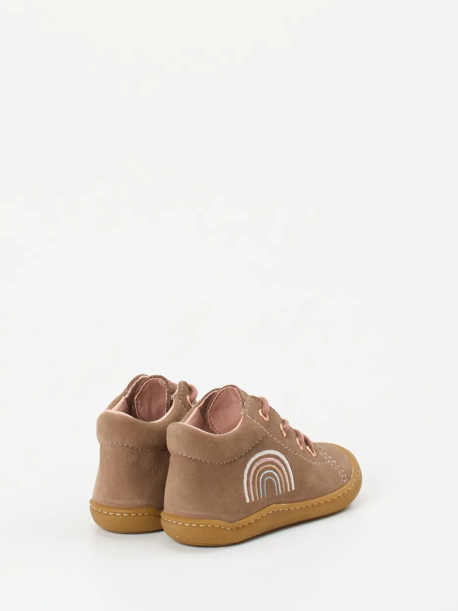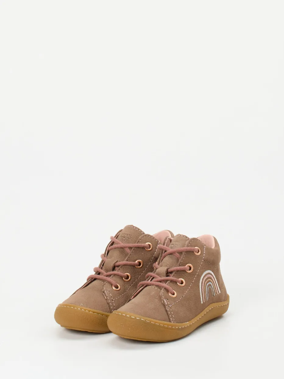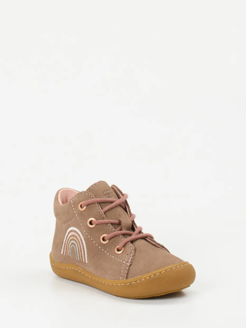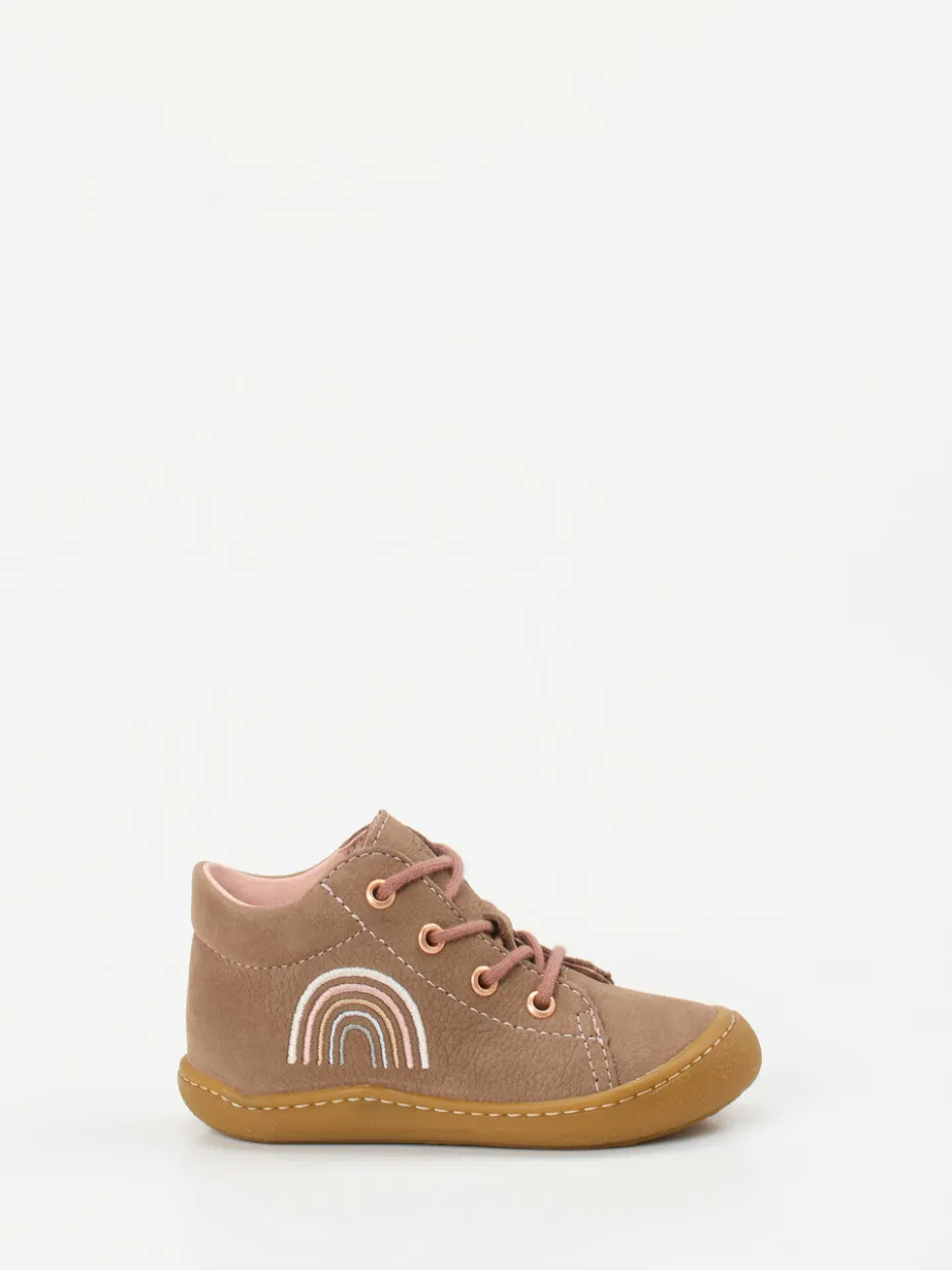 Pastellakzente für erste Schritte.Ricosta zeigt mit diesem knöchelhohen Lauflernschuh ein liebevoll gestaltetes Kindermodell. Ideal für Alltag und Freizeit begleitet dieses Modell erste Gehversuche mit einem weichen Innenfutter aus Leder und einem Obermaterial aus samtig angeschliffenem Nubukleder. Das mittelbraune Finish harmoniert mit cremeweißen und altrosafarbenen Akzenten sowie einer auffälligen Regenbogen-Stickerei. Eine rutschfeste Gummisohle mit kindgerechtem Profil sorgt für Griffigkeit, während roségoldene Ösen und die runde Silhouette skandinavisch inspirierten Minimalismus einbringen. Perfekt kombinierbar zu pastellfarbener Kinderkleidung im Scandi-Stil. Kindgerechtes Design trifft auf funktionale Verarbeitung mit Stilbewusstsein.