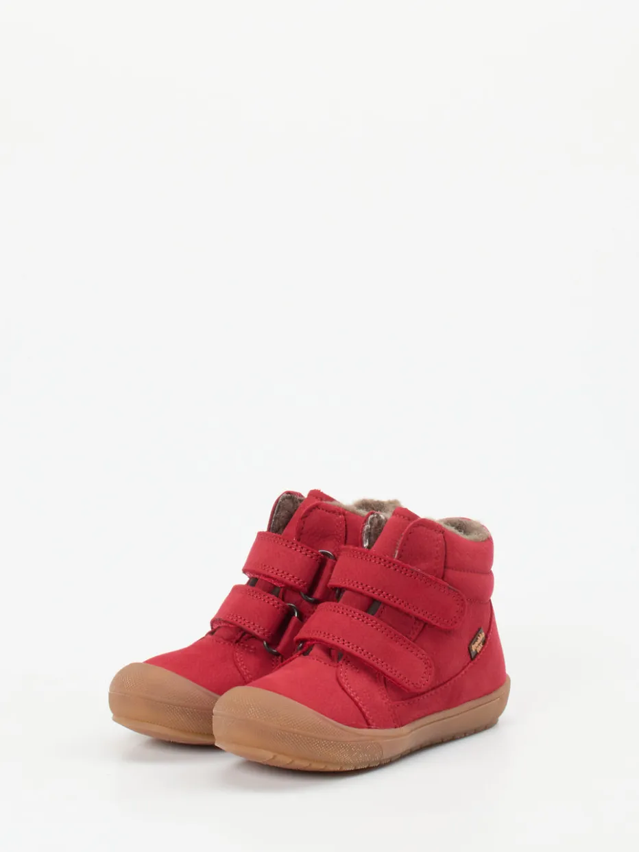 Hochwertiges Nubukleder, samtig angeschliffen und in leuchtendem Rot, verleiht dem Schuh eine besonders kindgerechte Optik. Das warme Wollfutter sorgt für angenehmes Klima, während die kontrastfarbene Gummisohle mit gutem Grip beim Laufenlernen unterstützt. Klettverschlüsse vereinfachen das Anziehen – ideal im turbulenten Familienalltag. Form und Finish greifen skandinavische Outdoorästhetik auf und passen hervorragend zur aktuellen Color-Pop Kidswear.