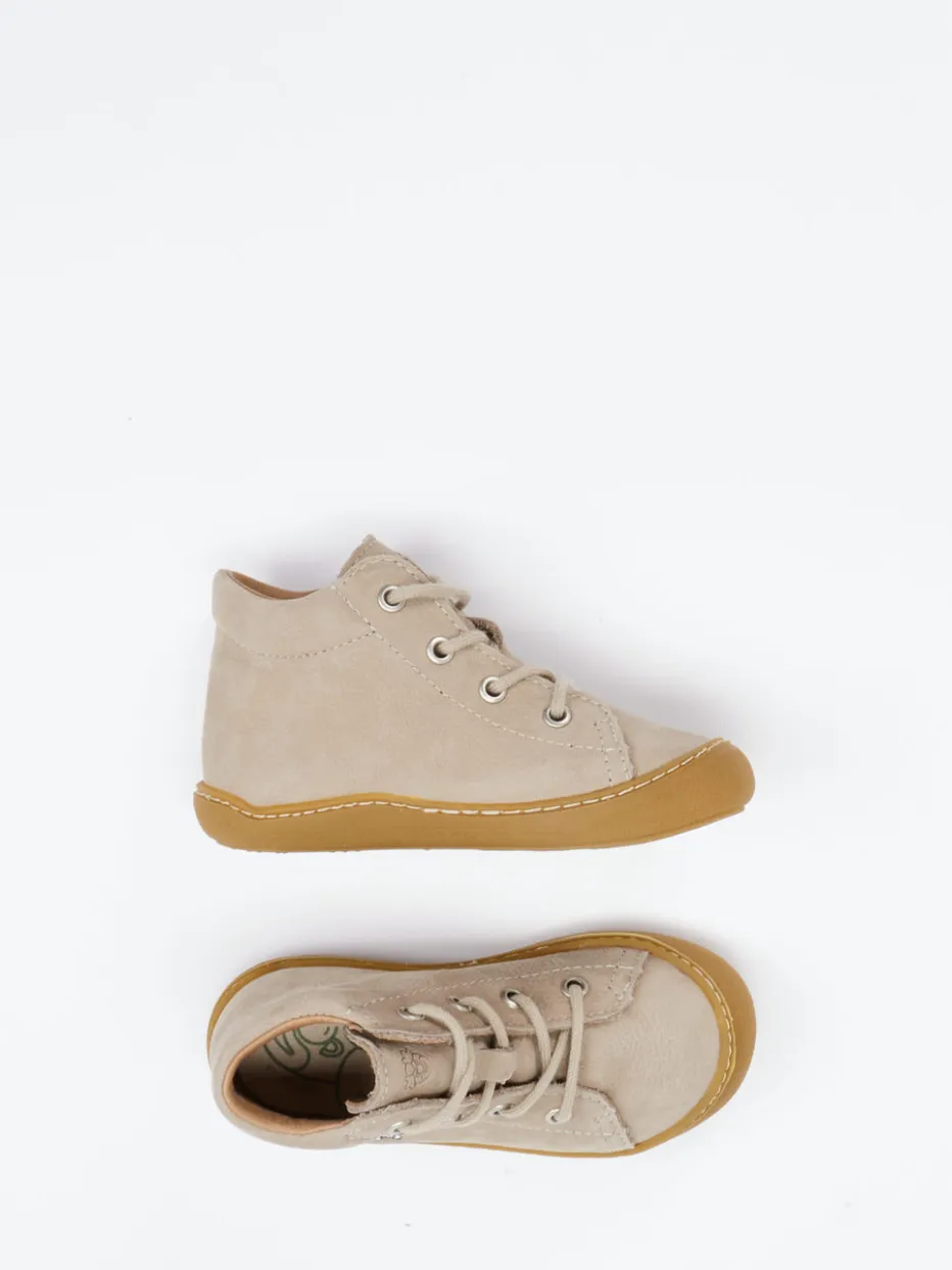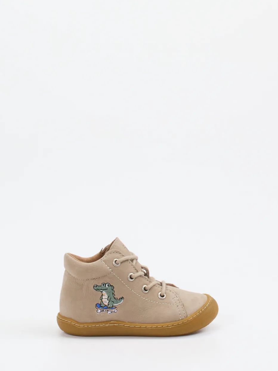 Verspielter Komfort für erste Abenteuer.Ricosta zeigt mit diesem Lauflernschuh ein Modell für die ersten Schritte im Alltag. Das beigebraune Nubukleder wirkt durch die samtig matte Oberfläche besonders weich und hochwertig. Die knöchelhohe Form mit robuster Schnürung bietet eine stabile Passform, während das Innenfutter aus Leder angenehm auf zarter Kinderhaut liegt. Ein farbig gesticktes Krokodilmotiv und die farblich abgesetzte honigfarbene Gummisohle sorgen für verspielte Akzente. Die rutschfeste Naturkautschuksohle umschließt zusätzlich beanspruchte Partien – ideal für Entdecker in der Lauflernphase. Ein liebevoll gestalteter Schuh mit Blick für Komfort und Details.