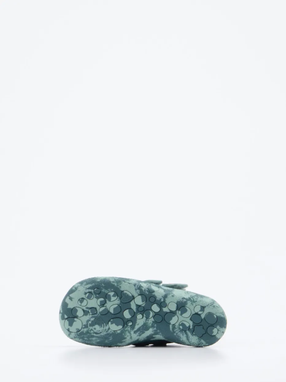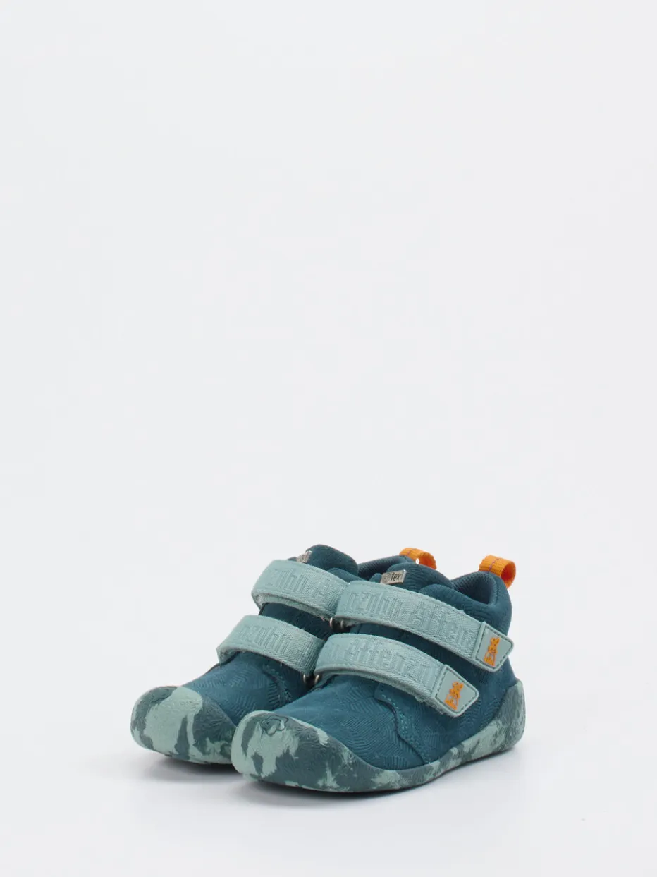Veloursleder mit matt strukturierter Oberfläche trifft auf kontrastreiche Farbakzente in Petrolgrün, Mint und Orange. Die kompakte, rund geformte Silhouette mit doppeltem Klettverschluss bietet sicheren Halt. Eine rutschfeste Gummisohle mit Herz- und Kreisprofil sorgt für Stabilität bei den ersten Entdeckungstouren. Die farbenfrohe Zuglasche hinten erleichtert das Anziehen. Ideal für Alltag und erste Outdoor-Erlebnisse – auch im Übergang.