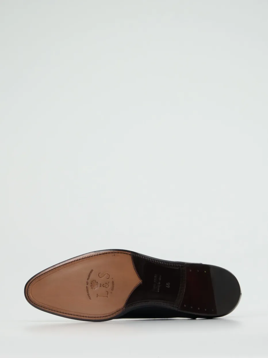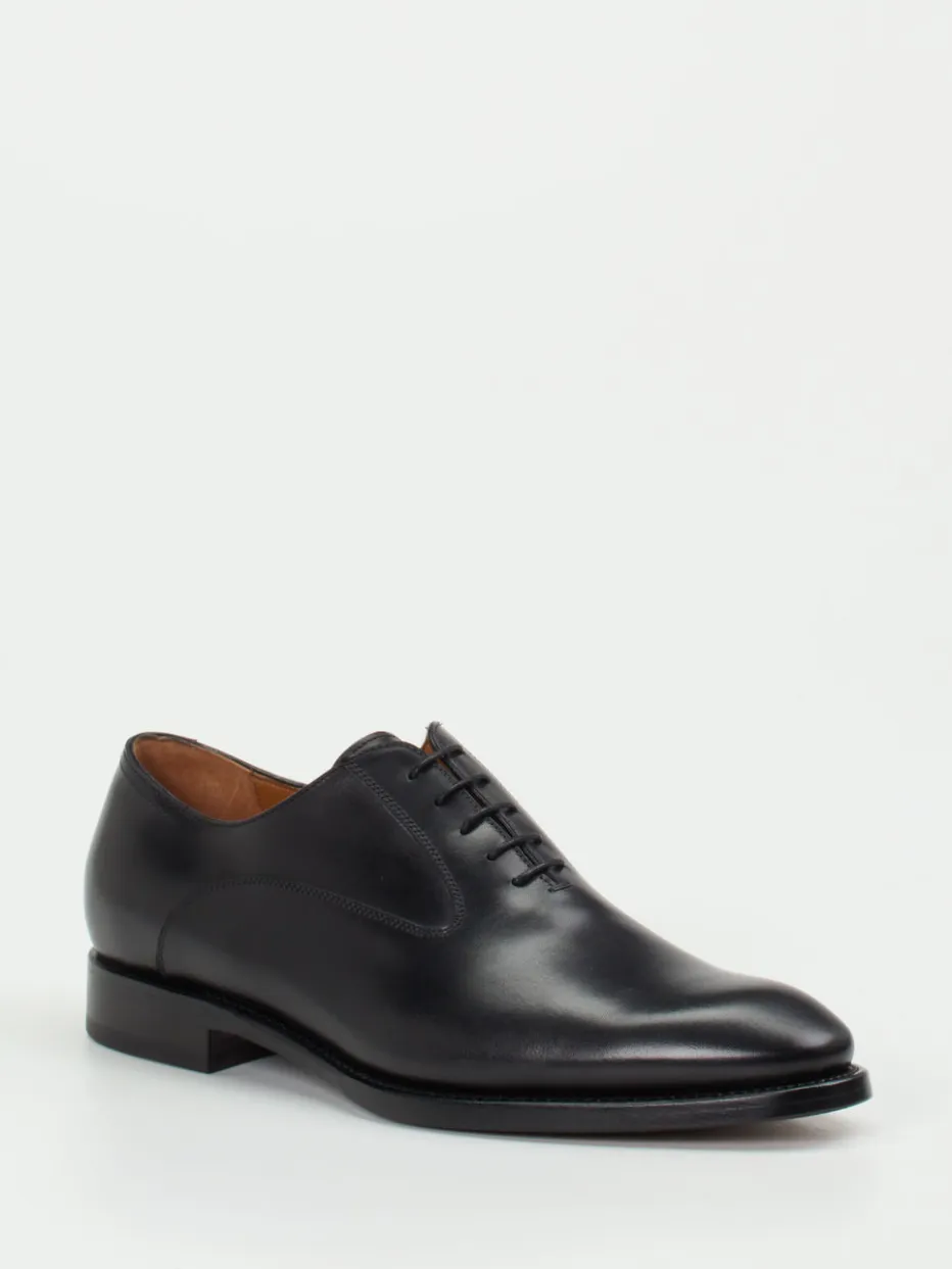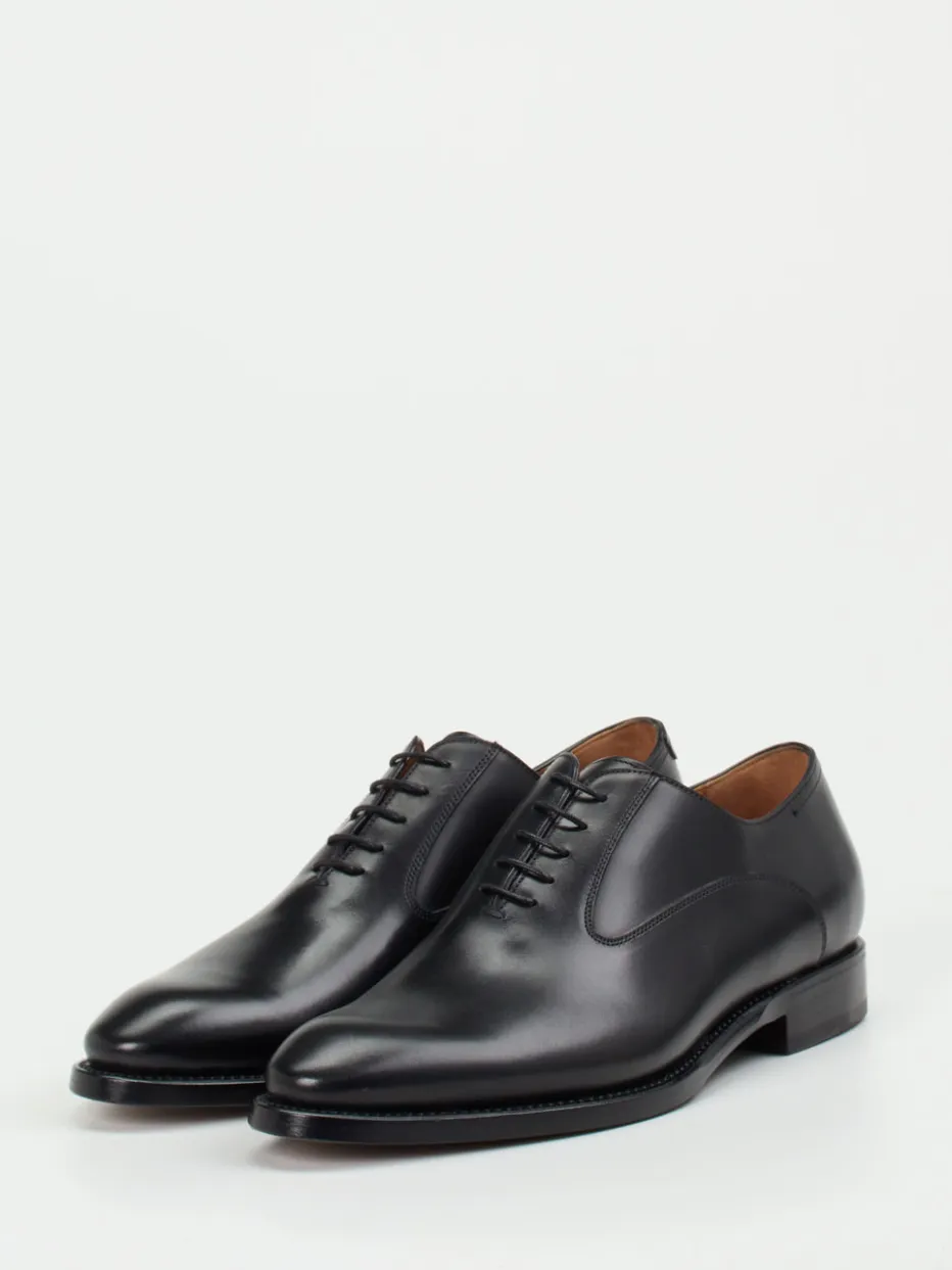 Mit seinem tiefschwarzen Kalbleder mit Glanzfinish und einer elegant schmal zulaufenden Silhouette überzeugt er im beruflichen wie festlichen Kontext. Die geschlossene Schnürung mit fünf Ösenpaaren und fein gearbeitete Ton-in-Ton-Nähte unterstreichen den minimalistischen Auftritt im Stil von „Quiet Luxury“. Seine rahmengenähte, teils gummierte Ledersohle spricht für langlebige Qualität und Eleganz. Besonders stimmig zu dunklem Anzug oder edlem Wollhosen-Outfit.