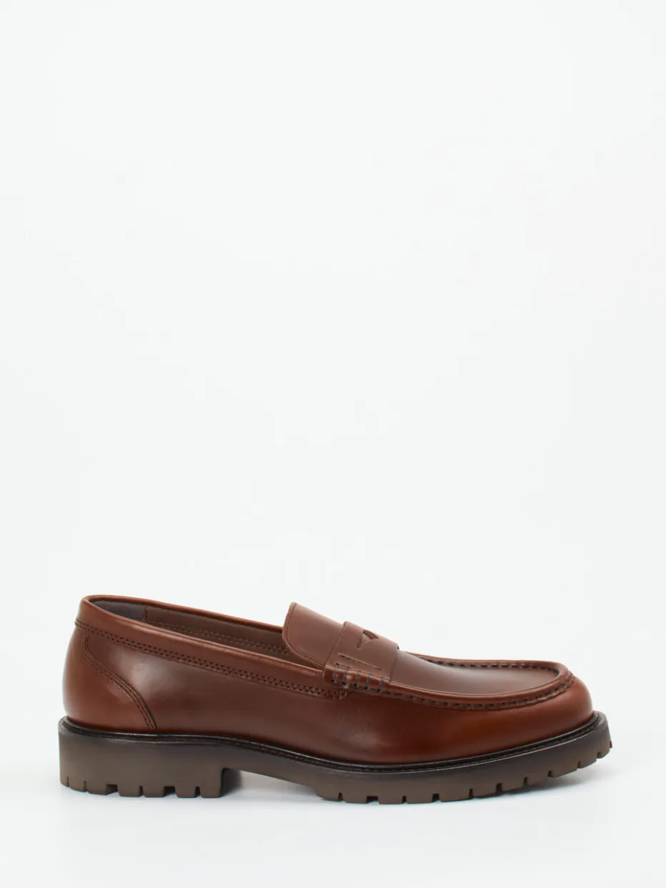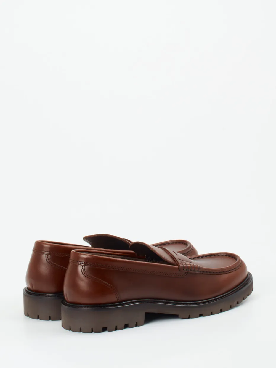 Dieser klassisch flache Loafer überzeugt mit cognacbraunem Fettleder, glänzender Oberfläche und robuster Profilsohle im Stil moderner Chunky-Trends.