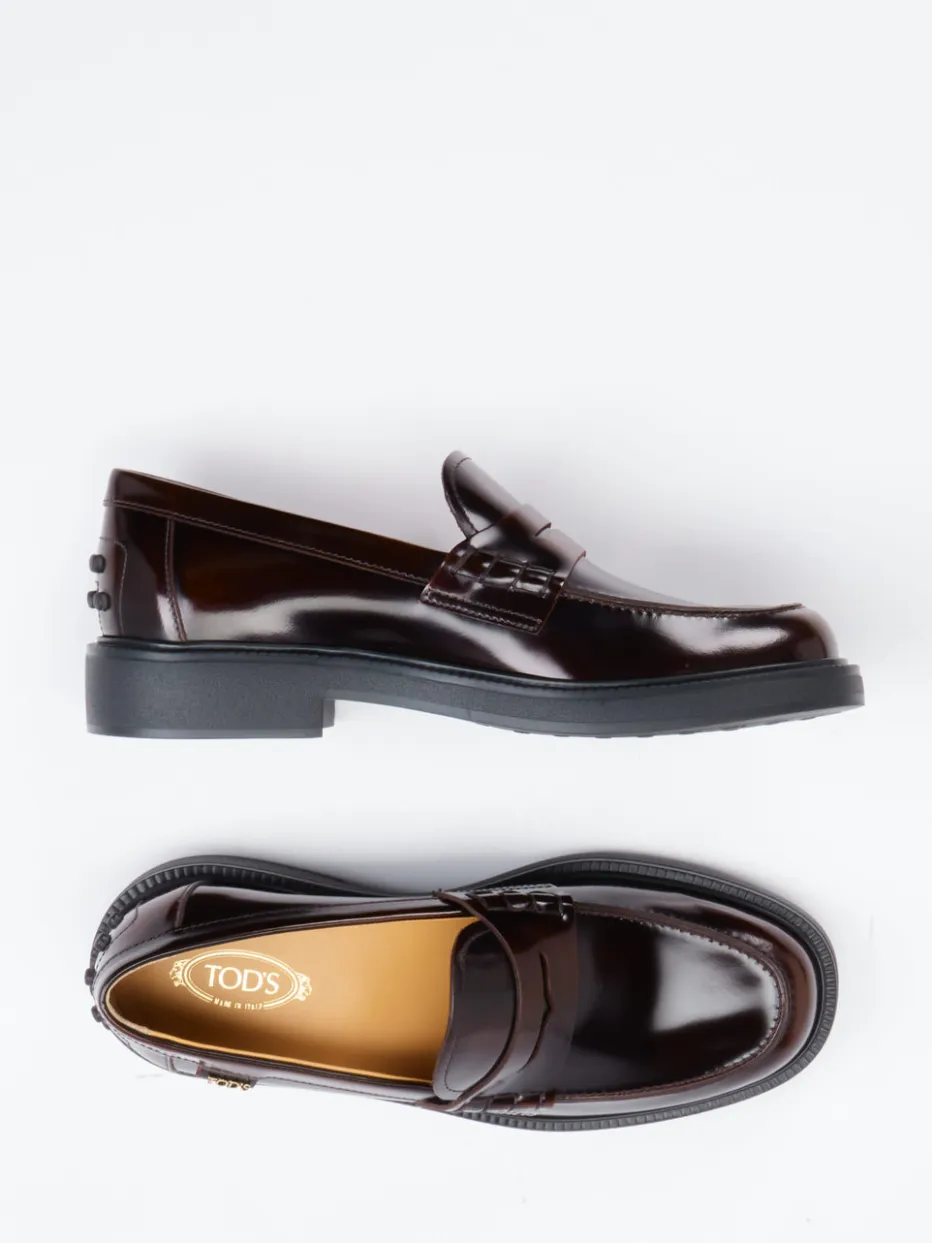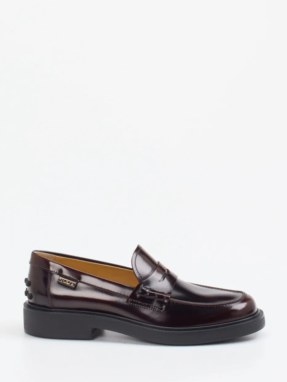 Glanzvoller Minimalismus für den Alltag.Tod’s interpretiert den klassischen Damenloafer neu und verleiht ihm mit burgunderfarbenem Hochglanzleder eine moderne Raffinesse. Ideal für Büro oder City-Termine bietet dieser Loafer eine ausgewogene Balance aus subtiler Eleganz und modischer Aktualität. Das veredelte Glattleder mit glänzender Oberfläche trifft auf eine langgezogene Silhouette, tonale Nähte und eine goldfarbene Logo-Plakette. Der Schlupfschuh überzeugt zudem durch eine Gummisohle in Leichtzell-Qualität und die typischen Noppen an der Ferse – ein ikonisches Designelement von Tod’s. Inspiriert vom Loafer-Revival für Herbst/Winter bleibt das Modell dennoch zeitlos kombinierbar, etwa mit schmaler Anzughose oder Midirock. Ein luxuriöses Statement – handwerklich vollendet und stilistisch souverän.