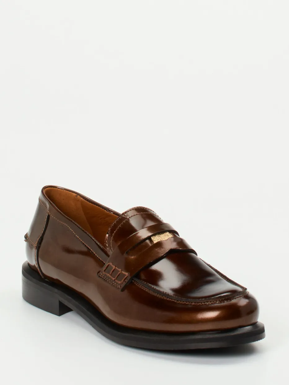 Stilvolle Akzente für Alltag und Büro.Maripé präsentiert mit diesem Damen-Loafer eine minimalistische Interpretation klassischer Eleganz. Hochglanzleder in schokobraunem Farbton verleiht dem Schuh seine elegante Wirkung, während das goldfarbene Detail auf der offenen Zierlasche ein luxuriöses Highlight setzt. Die typisch flache Silhouette mit dezentem Blockabsatz sowie das gepolsterte Kalblederfutter bieten hohen Tragekomfort – ideal für Büro und City-Streifzüge. Die robuste Gummisohle ergänzt das Alltagsprofil rutschhemmend. Der Look passt besonders zu schmal geschnittenen Hosen oder fließenden Röcken. Ein hochwertiger Klassiker mit italienischer Signatur und dezenter Modernität.