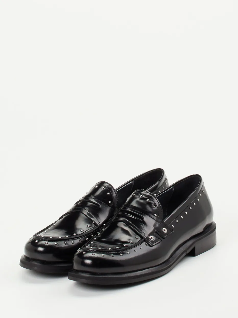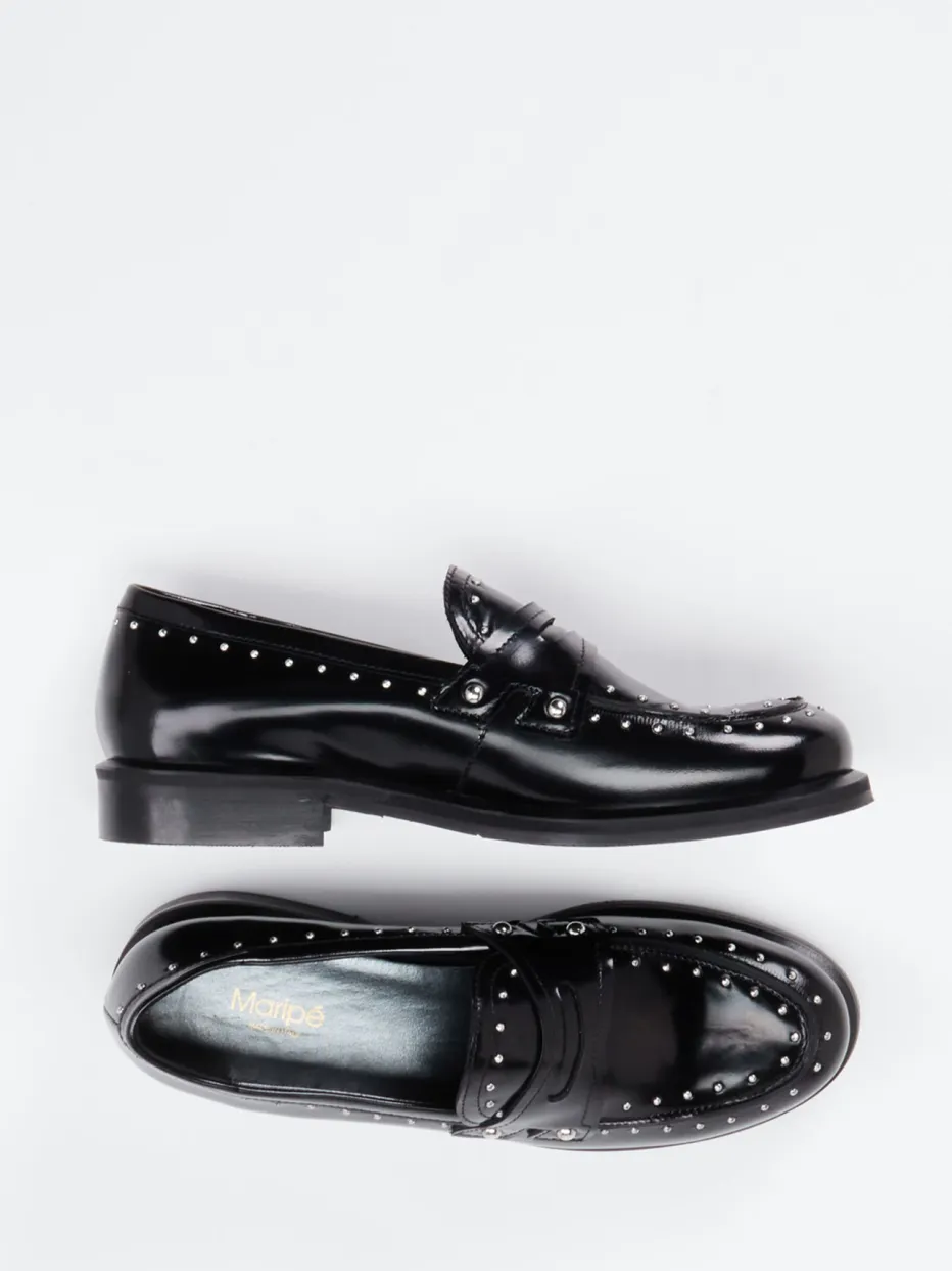 Dieser Loafer von Maripé vereint edles Hochglanzleder mit rockigen Details wie silberfarbenen Nieten – ein stilbewusster Akzent zwischen Klassik und Punk.
