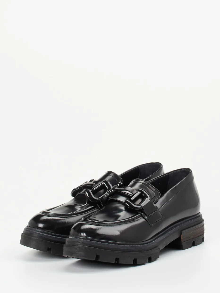 Mit schwarzem Hochglanzleder und markanter Chunky-Sohle verbinden diese Loafer italienische Eleganz mit urbanem Trendbewusstsein – ein Statement für moderne Looks.