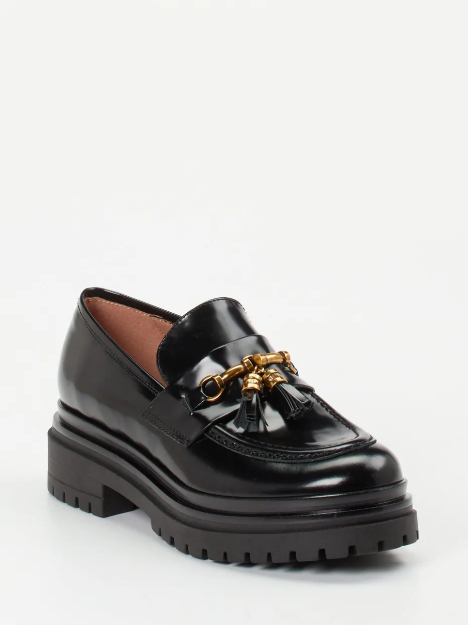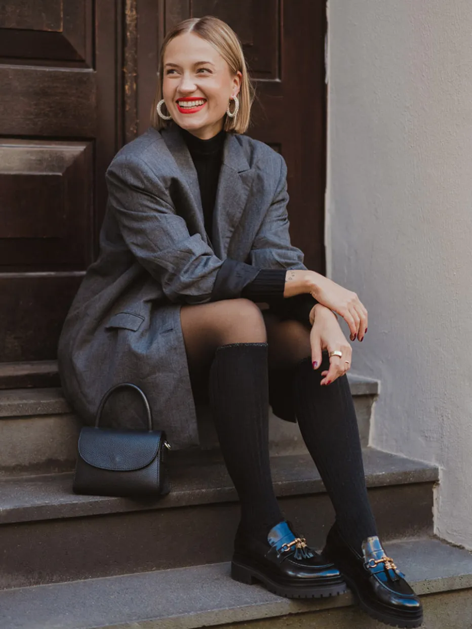 Eleganz trifft Trendgespür.Konstantin Starke präsentiert mit diesem Damen-Loafer eine zeitgemäße Interpretation des Klassikers. Ideal für stilvolle Office-Tage oder urbane Freizeitmomente: Das schwarze Hochglanzleder mit glatter, glänzender Oberfläche strahlt eine luxuriöse Anmutung aus. Die klassische, rund geformte Silhouette wird durch goldfarbene Hardware und dekorative Quasten modern akzentuiert. Die dezent erhöhte Gummisohle mit 3 cm Absatz bietet Trittsicherheit, während das gepolsterte Innenleben aus Kalbleder komfortabel durch den Tag trägt. Goldtöne und Chunky-Sohlendetails fügen sich harmonisch in aktuelle Herbst-/Wintertrends ein und lassen sich vielseitig mit schlichten Kleidern oder Mini-Bags kombinieren. Ein raffinierter Loafer mit Komfort und Stil – Konstantin Starke setzt gekonnt auf Detailqualität.