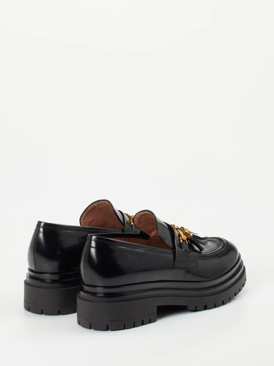 Ein Statement-Piece für stilbewusste Looks: Der elegante Loafer überzeugt mit glänzendem Leder und goldfarbener Akzentkette – klassisch interpretiert mit modernem Twist.