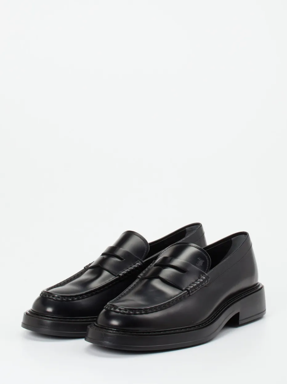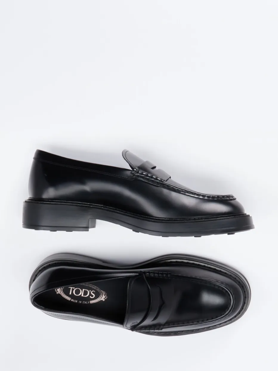 Dieser edle Herrenloafer von Tod’s kombiniert glänzendes Kalbleder mit einer markanten Profil-Gummisohle im modernen Preppy-Stil. Optimal für stilbewusste Business- und Freizeitlooks.
