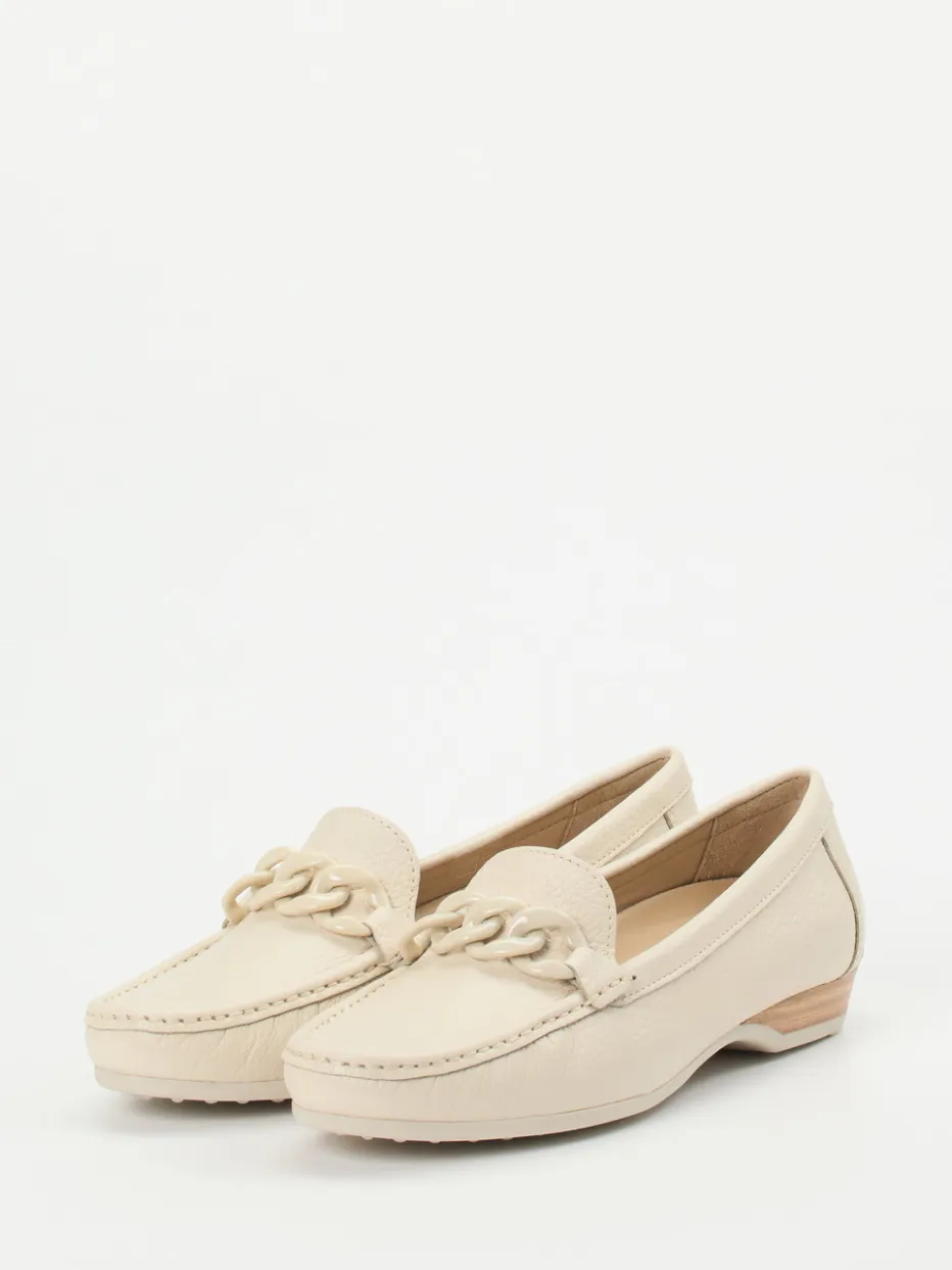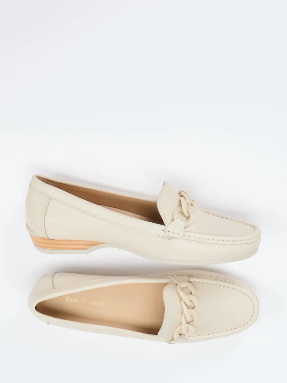 Geradlinige Eleganz trifft Komfort.Ralph Harrison präsentiert einen klassischen Loafer für Damen mit stilvoller Zurückhaltung. Ob im Büro oder im Alltag: Das Modell überzeugt mit fein genarbtem Kalbleder in Cremebeige, einer tonalen Kunststoffkette und einem leicht erhöhten Absatz in Holzoptik. Die weich gepolsterte Lederdecksohle und das profilierte Noppensohlen-Design garantieren angenehmen Laufkomfort. Die flache Silhouette in Schlupfform betont den minimalistischen Look und passt zu Preppy-Styling sowie Soft-Neutrals-Trends der Saison. Kombiniert mit beigefarbener Stoffhose entsteht ein stilsicherer Auftritt. Ralph Harrison steht hier für hochwertige Verarbeitung und leise Raffinesse.