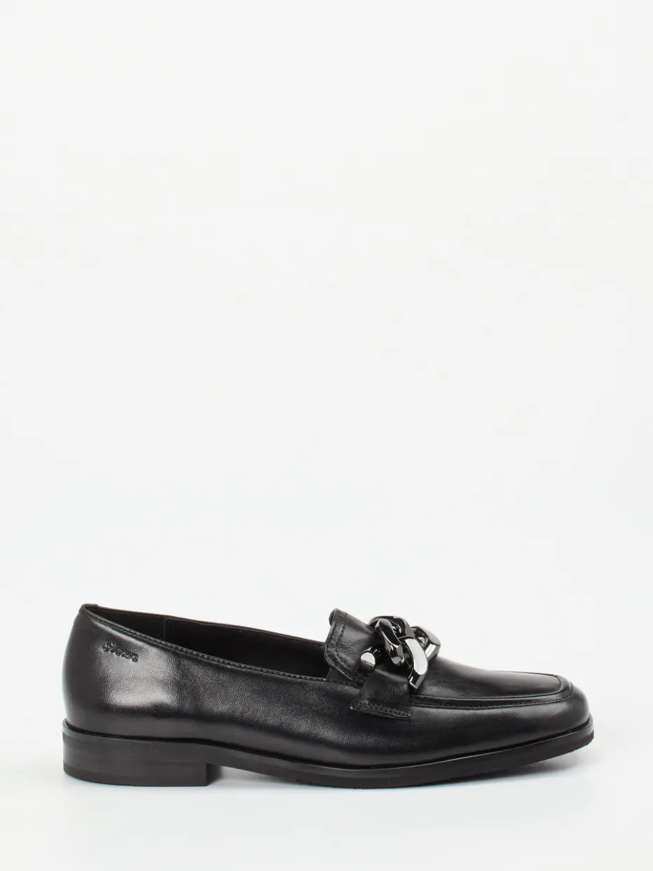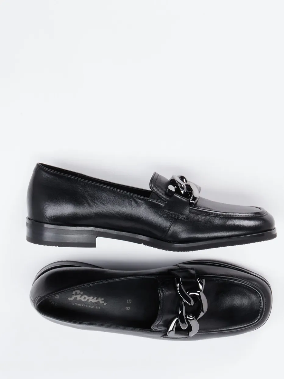 Dieser Damen-Loafer von Sioux vereint hochwertiges Kalbleder mit einem modernen Kettendetail – perfekt für stilbewusste Auftritte zwischen Büro und City.