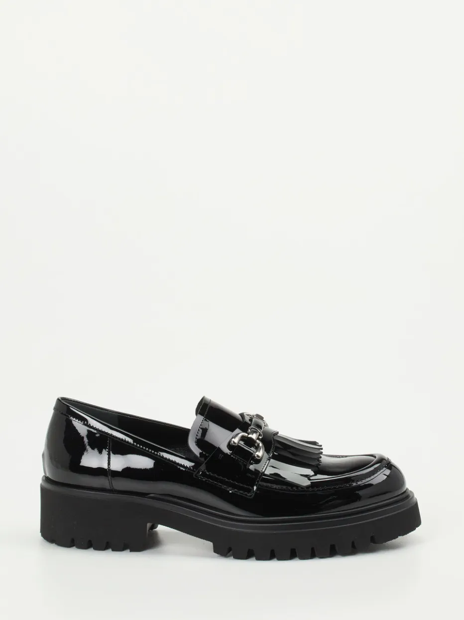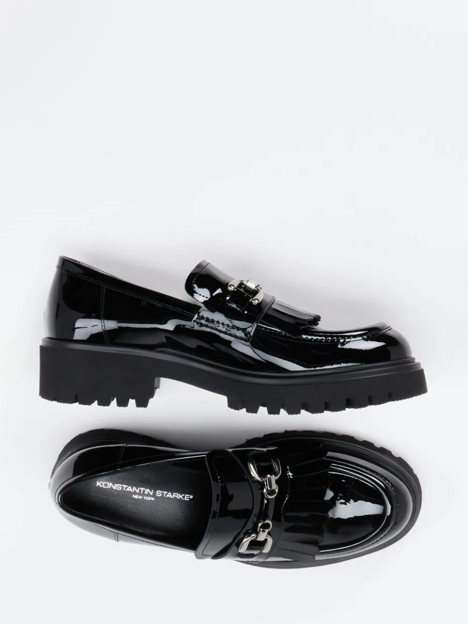 Glanzstücke für stilvolle Auftritte.Konstantin Starke präsentiert diesen luxuriösen Damen-Loafer mit glänzender Oberfläche und klarem modischen Anspruch. Ideal für urbane Looks zwischen Office und Event: Hochwertiges Kalbleder mit spiegelndem Finish sorgt für eine elegante Anmutung, während silberfarbener Trensenschmuck und Fransenbesatz auf der Mokassinblende raffinierte Akzente setzen. Die profilierte Chunky-Sohle in Leichtzellbauweise bringt Komfort und Grip auf herbstlichen Straßen. Klassische Silhouette trifft auf preppy Details im angesagten Streetwear-Kontext – perfekt für stilbewusste Kombinationen mit Oversized-Blazer oder Mini-Bag. Konstantin Starke verbindet feminine Eleganz mit trendorientiertem Design und exzellentem Tragegefühl.