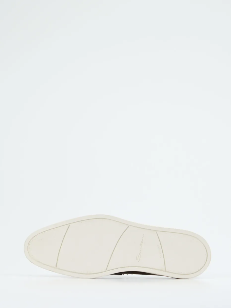 Eleganz trifft auf Komfort.Santoni bringt stilvolle Herren-Loafer in die Garderobe – gefertigt aus mittelbraunem Kalbleder mit changierendem Finish und matt anmutender Oberfläche. Für Büro oder Freizeit bietet der klassisch-flache Slipper in Schlupfform mit weißer Gummisohle und gepolsterter Innensohle hohen Tragekomfort. Der Penny-Strap und die handvernähten Mokassin-Nähte betonen den italienisch-minimalistischen Stil. Das orangefarbene Innenfutter aus weichem Leder setzt einen ebenso eleganten wie unerwarteten Farbkontrast. White-Sole-Look und klare Lines machen ihn zu einem Favoriten für Smart-Casual-Kombinationen. Der Loafer steht für zurückhaltenden Luxus und handwerkliche Raffinesse made by Santoni.