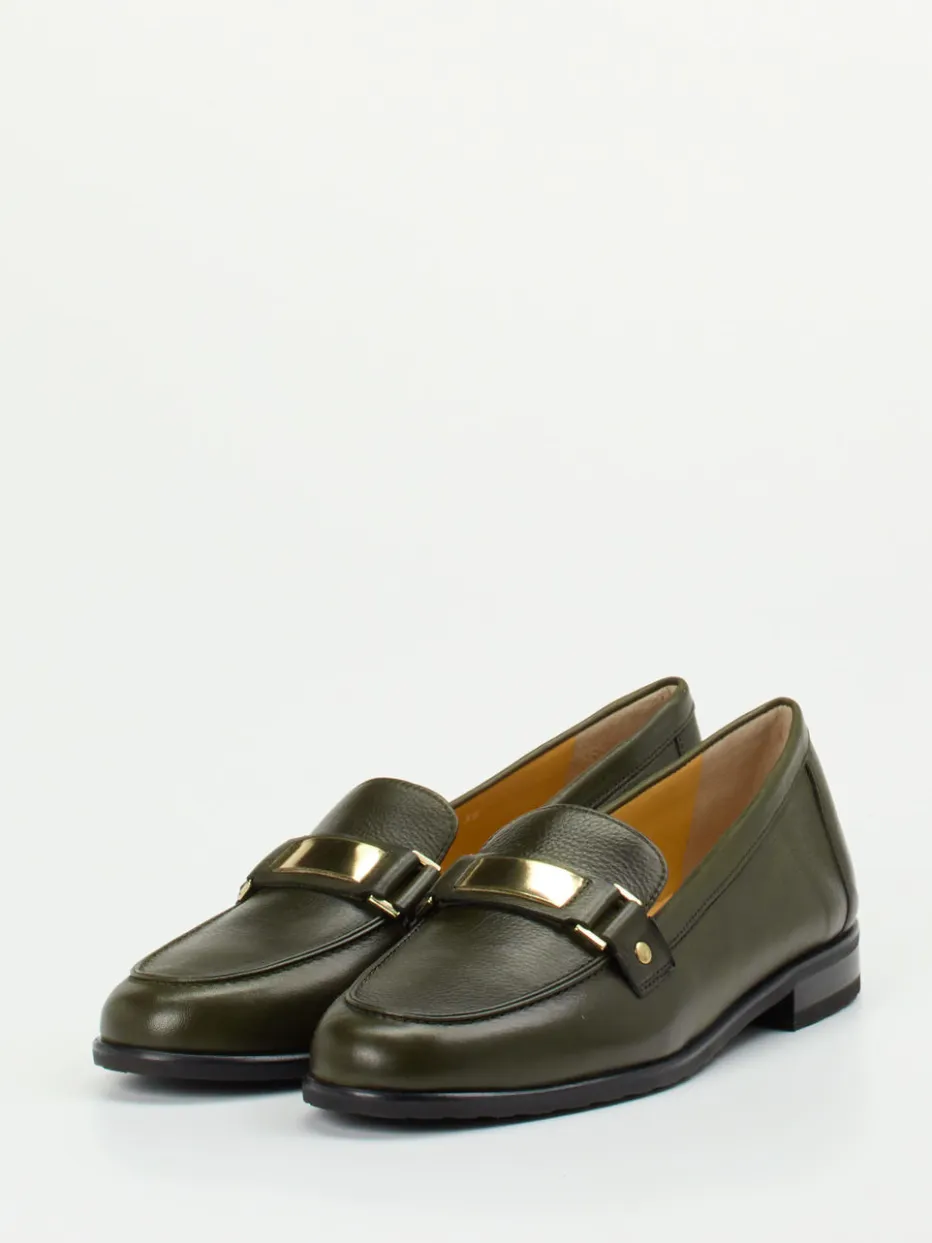 Stilvoll durch den Herbst.Die Marke Truman’s präsentiert mit diesem Damen-Loafer ein Modell, das zeitlosen Chic und moderne Zurückhaltung kombiniert. Ob im Büro oder bei stilsicheren Alltagsmomenten – der Slipper überzeugt in olivgrünem, genarbtem Kalbleder mit edler Zierschnalle in Goldoptik. Die klare Formensprache unterstreicht das klassische Design, während die flach profilierte Gummisohle mit Absatz in Holz-Optik subtil Akzente setzt. Der Schlupfschuh orientiert sich am „Quiet Luxury“-Trend und harmoniert bestens mit zurückhaltenden Preppy-Looks. Ideal zur beigen Wollhose oder Ledertasche in Cognac. Truman’s steht für glaubwürdige Qualität und dezente Raffinesse.