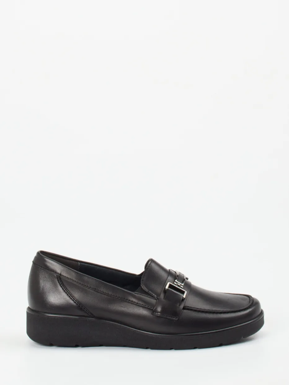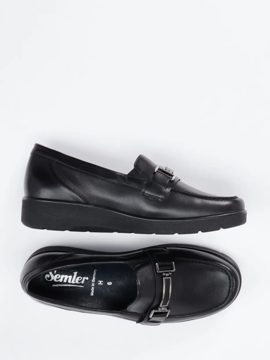Schlichte Eleganz für tägliche Ansprüche.Semler präsentiert einen Damen-Loafer mit betontem Komfortfaktor in klassischer Silhouette. Ideal für berufliche Meetings oder entspannte Stadtbesuche: Das Modell kombiniert schwarzes, glänzendes Kalbleder mit matter Oberfläche und einer silberfarbenen Schnalle. Dank bequemer Weite H und einem gepolsterten, herausnehmbaren Fußbett bietet der Loafer spürbare Entlastung. Die profilierte Leichtzellsohle in PU-Ausführung steht für Stoßdämpfung und Griffigkeit. Der zurückhaltende Look passt zum aktuellen „Quiet Luxury“-Trend. Dazu kombinieren sich dunkle Stoffhosen oder elegante Röcke besonders stimmig. Stilvolle Leichtigkeit mit semler-typischem Komfortanspruch.