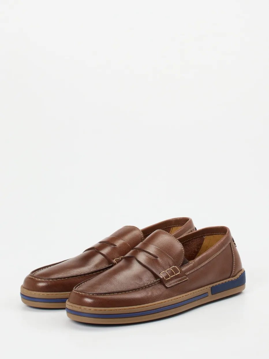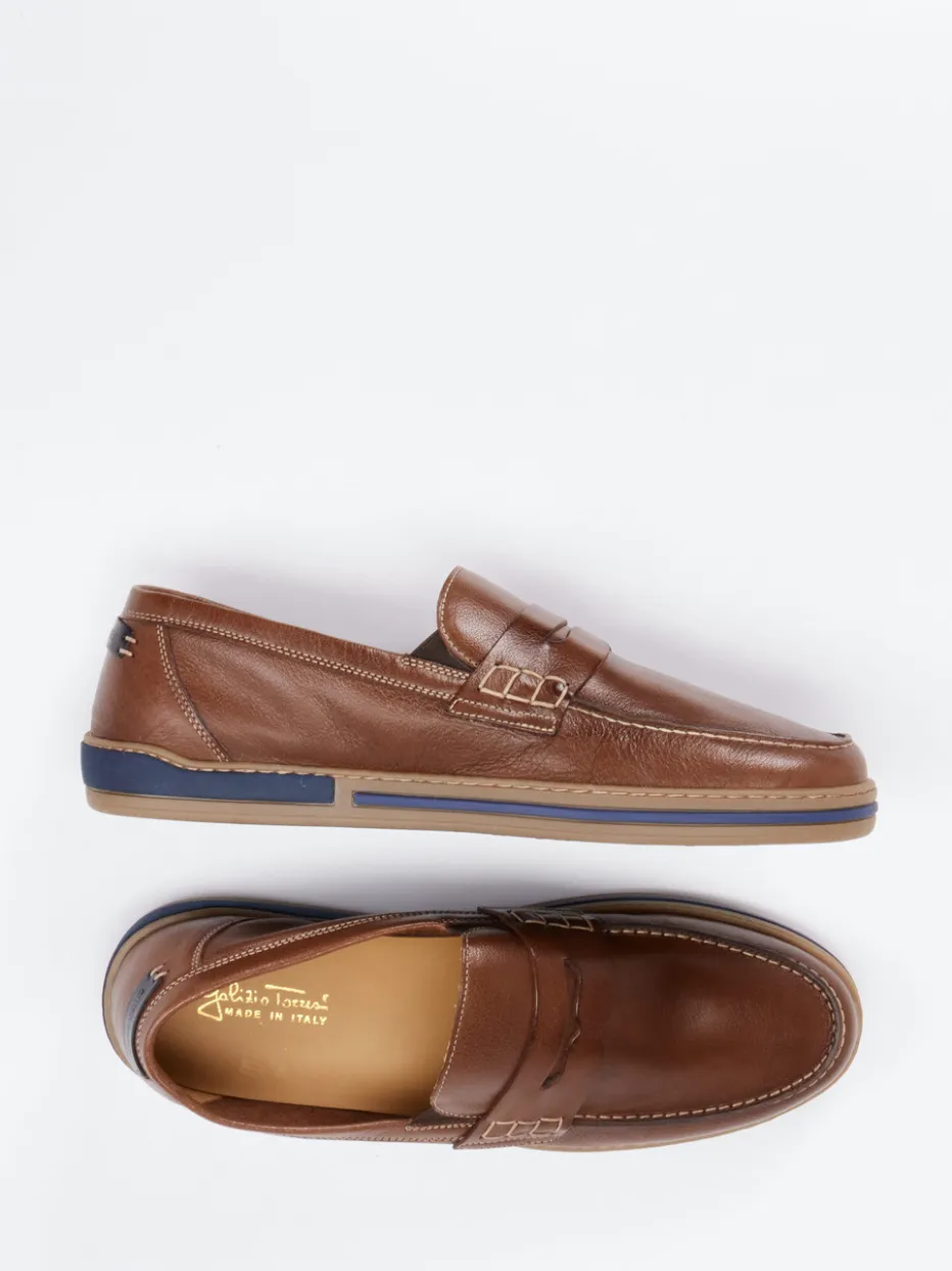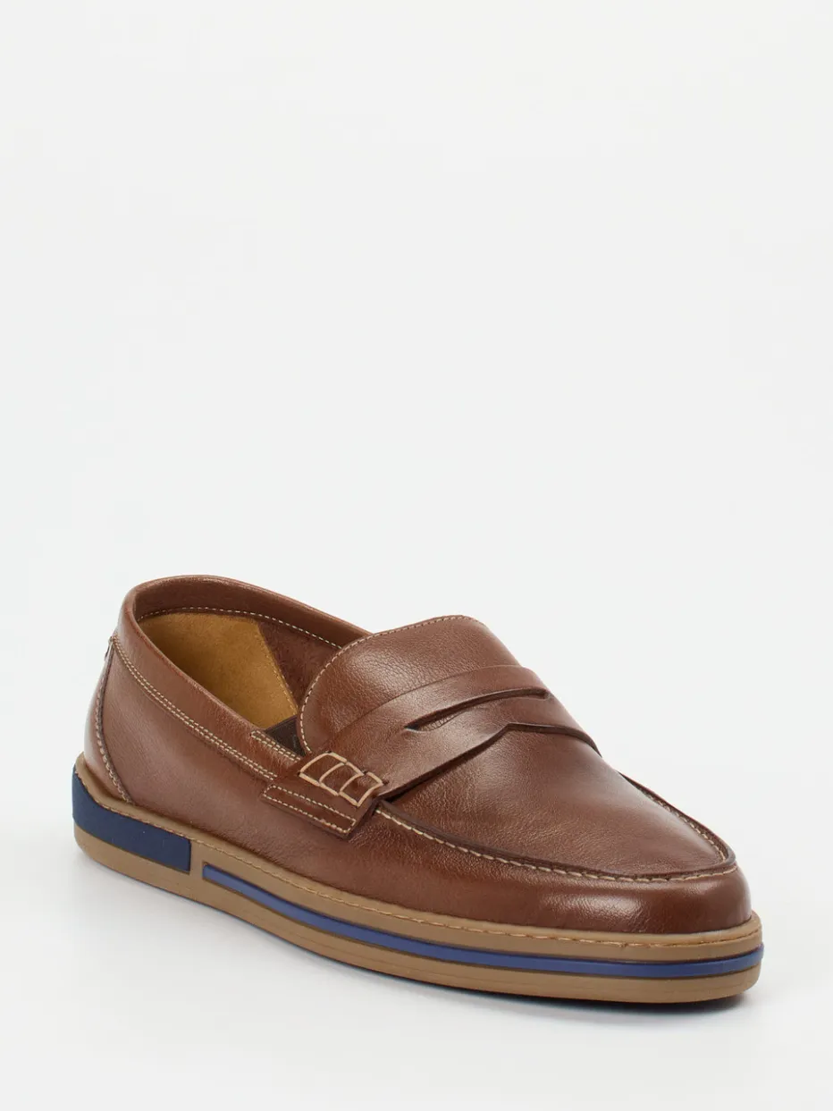 Italienische Raffinesse trifft smarten Komfort.Galizio Torresi steht für stilvolle Herren-Halbschuhe mit hoher Materialqualität. Dieser Loafer vereint luxuriöses, glänzend verarbeitetes Kalbleder in Mittelbraun mit einer flexiblen Gummisohle samt marinem Kontraststreifen. Ideal für Tage mit wechselnden Terminen – im Büro wie beim City-Bummel. Die klassisch flache Silhouette, Penny-Slot-Zunge und helle Kontrastnähte unterstreichen die moderne Preppy-Ästhetik. Der herausnehmbare, lederbezogene Einsatz sorgt für individuellen Komfort, ergänzt durch elastische Einsätze am Einstieg. Lässt sich bestens zu Chinohosen und leichten Sakkos kombinieren. Italienische Verarbeitung für anspruchsvoll maskuline Looks.