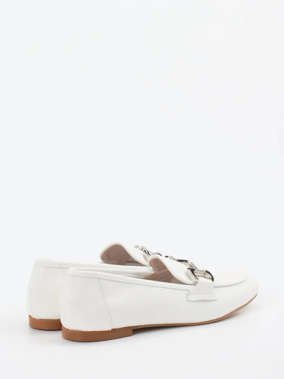 Fein genarbtes Kalbleder in Offwhite trifft auf klassische Eleganz. Die silberne Horsebit-Spange verleiht dem Loafer eine edle Note im Stil des Quiet Luxury.