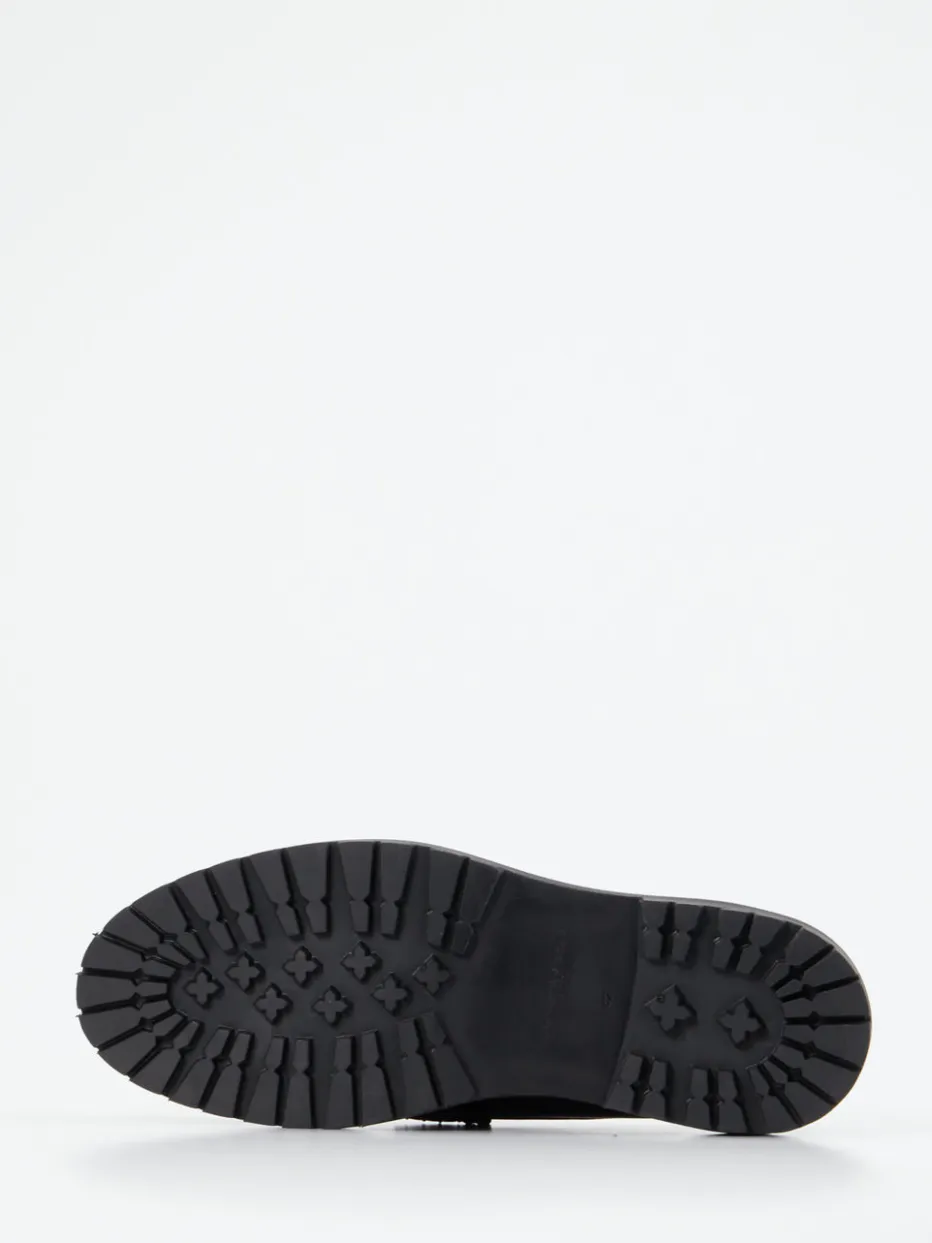 Zeitlose Silhouette trifft auf eine markant profilierte Sohle – dieser Loafer vereint klassische Formgebung mit modernen Akzenten in Schwarz.