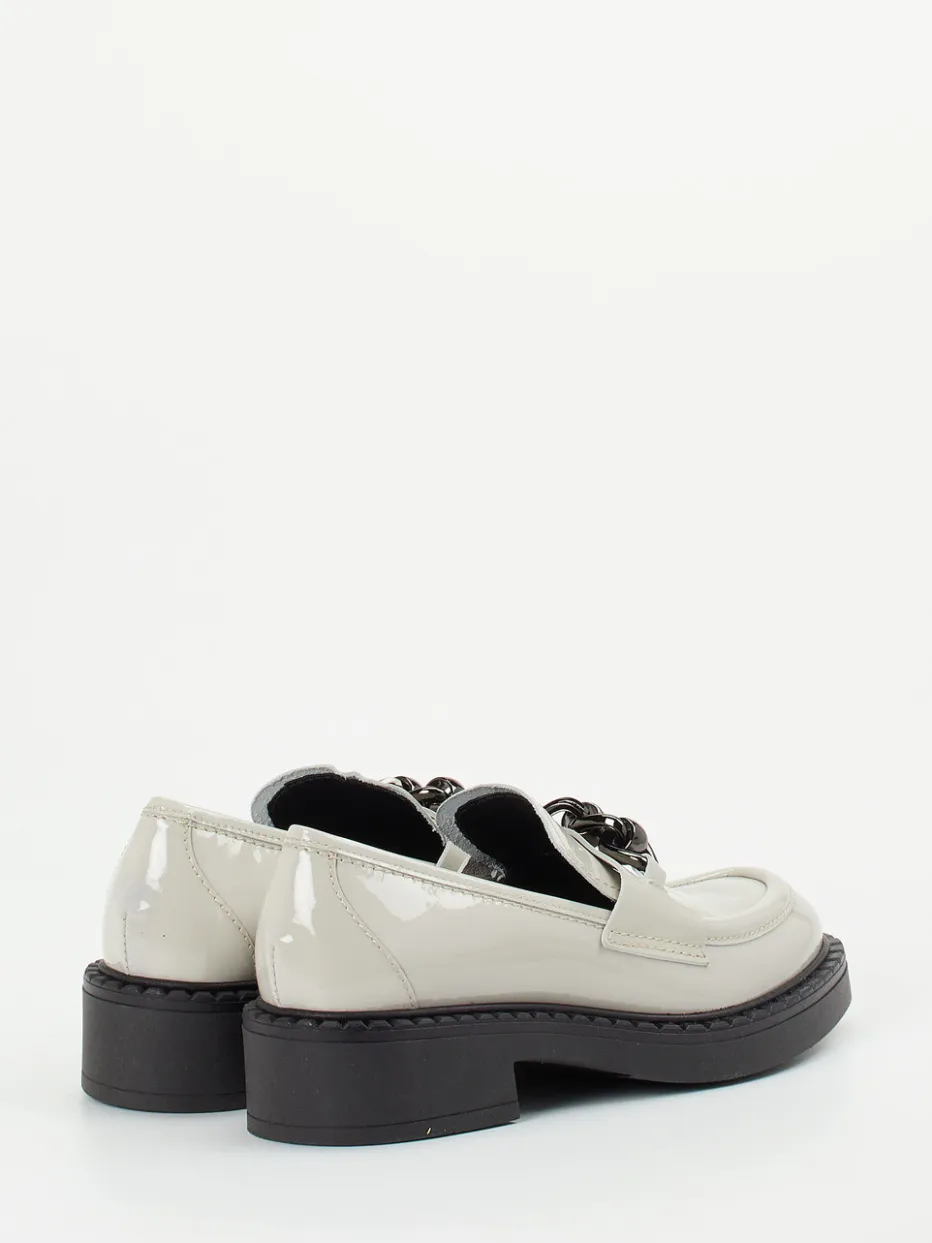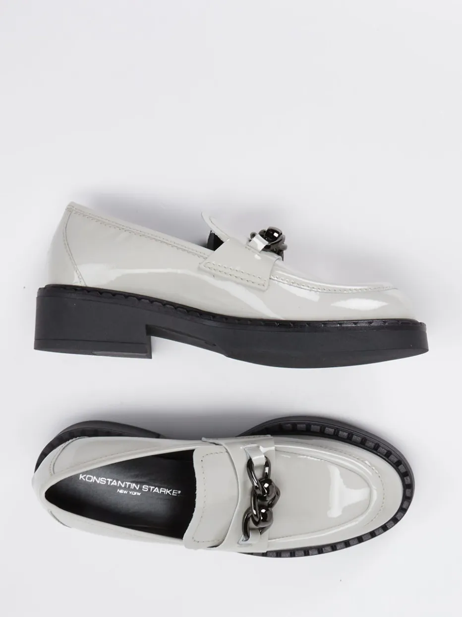 Minimalistischer Chic trifft auf Trendstärke.Konstantin Starke präsentiert einen eleganten Damen-Loafer mit klarem Designfokus. Für den modernen Office-Look oder stilvolle City-Tage: Gefertigt aus cremegrauem Lackleder mit glänzender Oberfläche, zeichnet sich dieses Modell durch die klassische Lowcut-Silhouette, eine schwarze Gliederkette als Zierspange und eine robuste Chunky-Gummisohle aus. Die Mokassinnaht und die offenkantige Bride unterstreichen das strukturierte Design. Dank Lederfutter und gepolstertem Fußbett bleibt der Tragekomfort nicht auf der Strecke. Klare Linien und dezente Streetwear-Akzente machen ihn zum idealen Begleiter für minimalistische Looks. Ein Loafer mit Substanz – modisch pointiert, detailstark gesetzt.