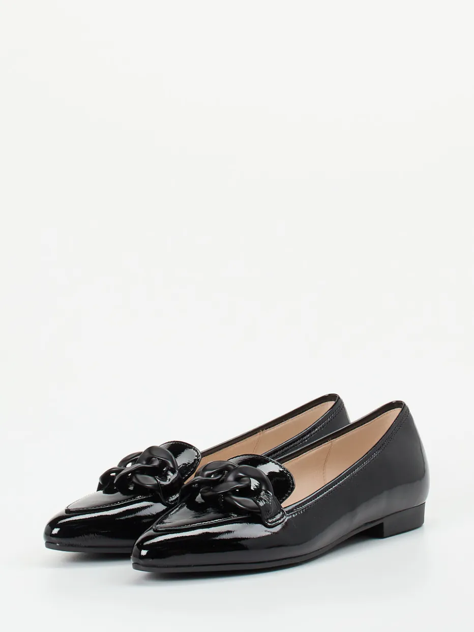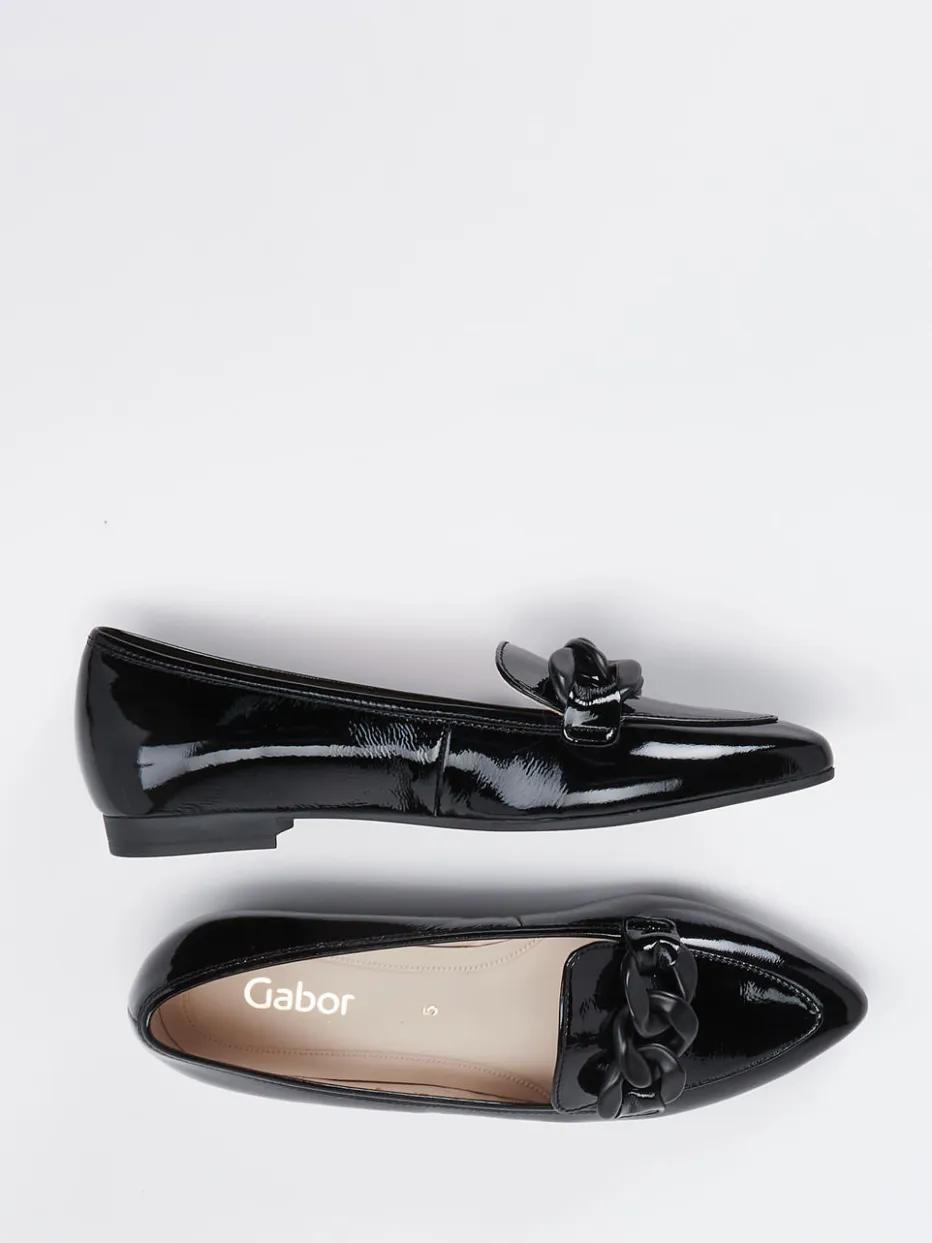 Dieser elegant geschliffene Loafer von Gabor überzeugt mit schwarzem Lackleder, feiner Gliederkette und klassischer Linienführung – stilvoll und komfortabel zugleich.