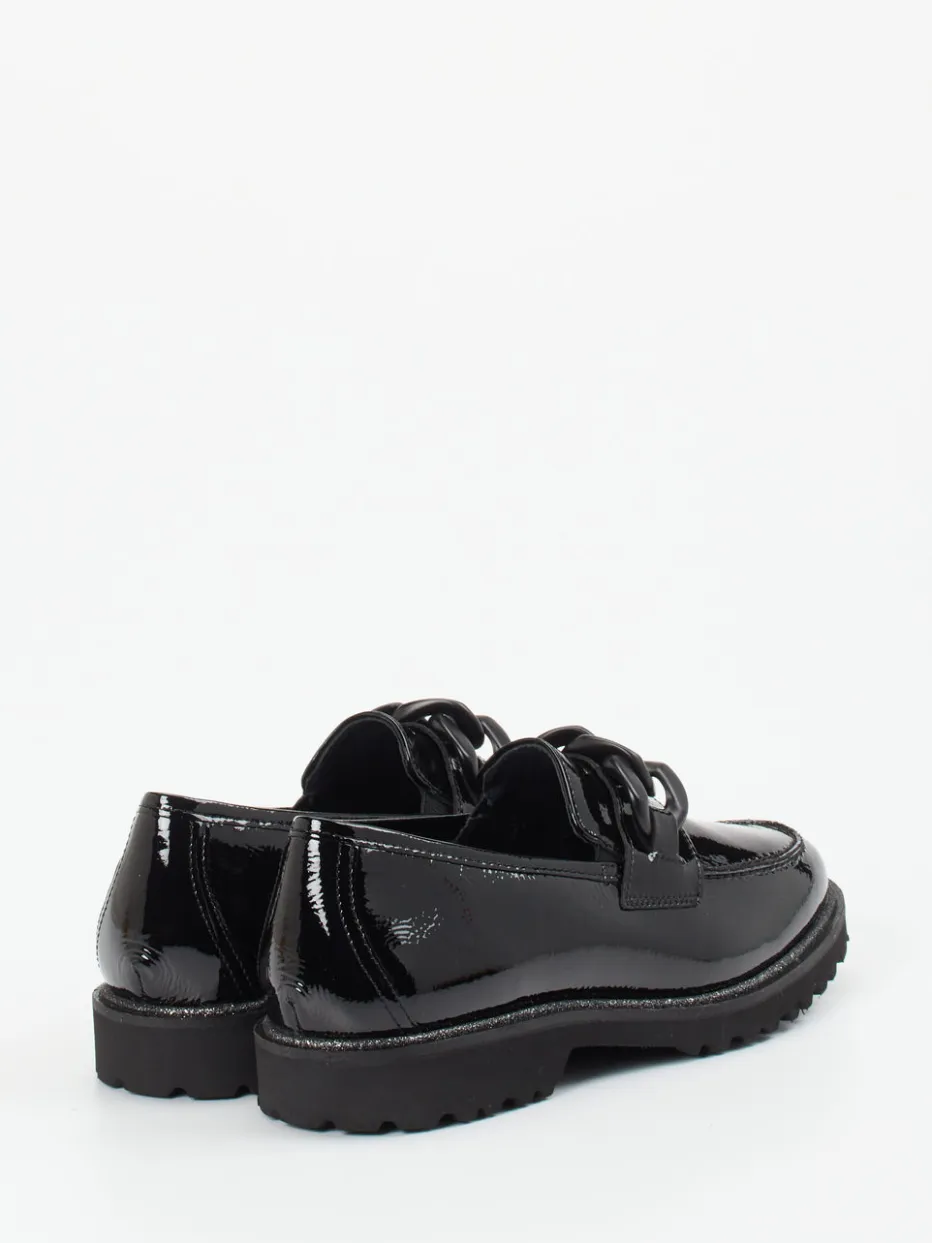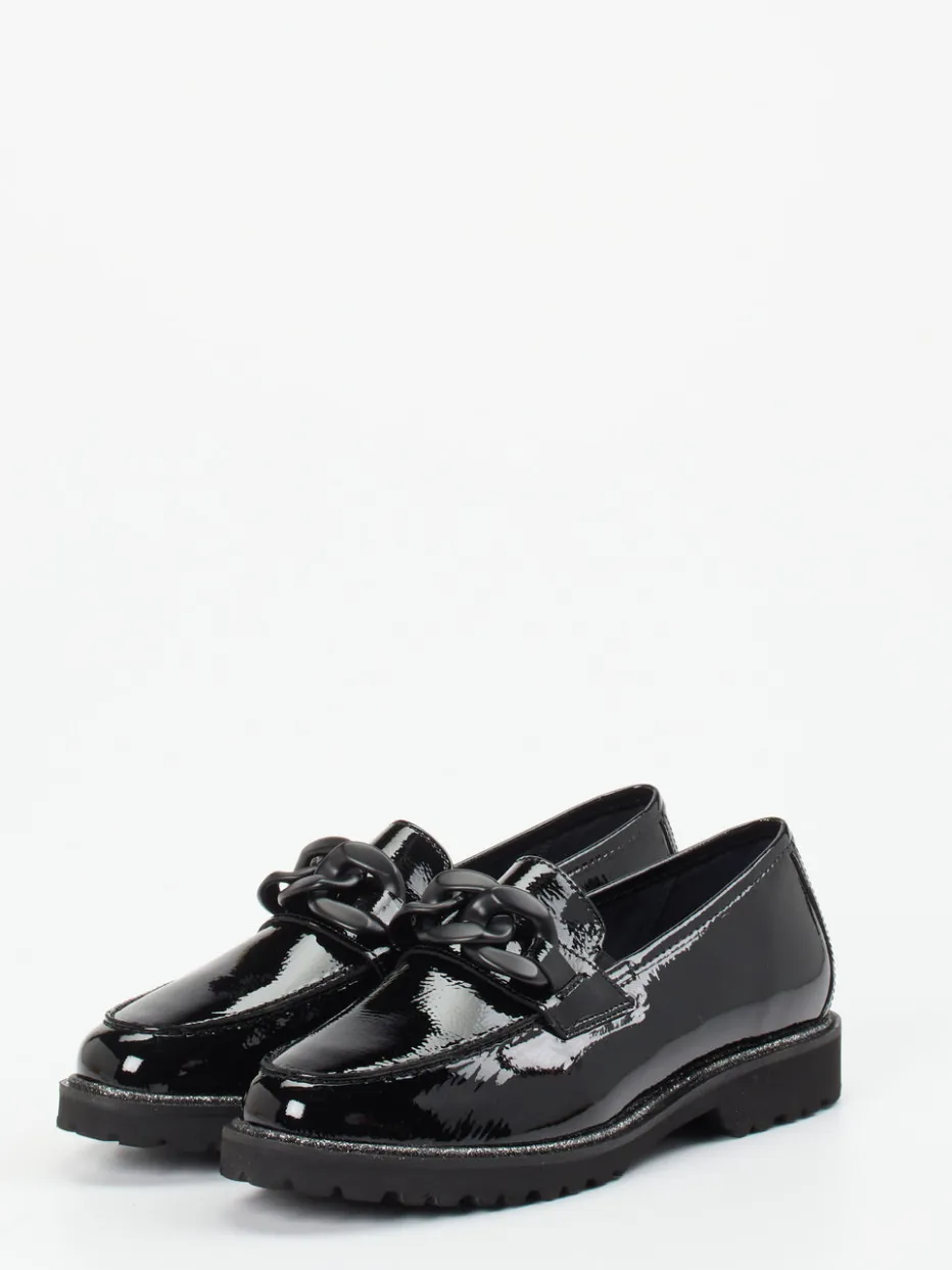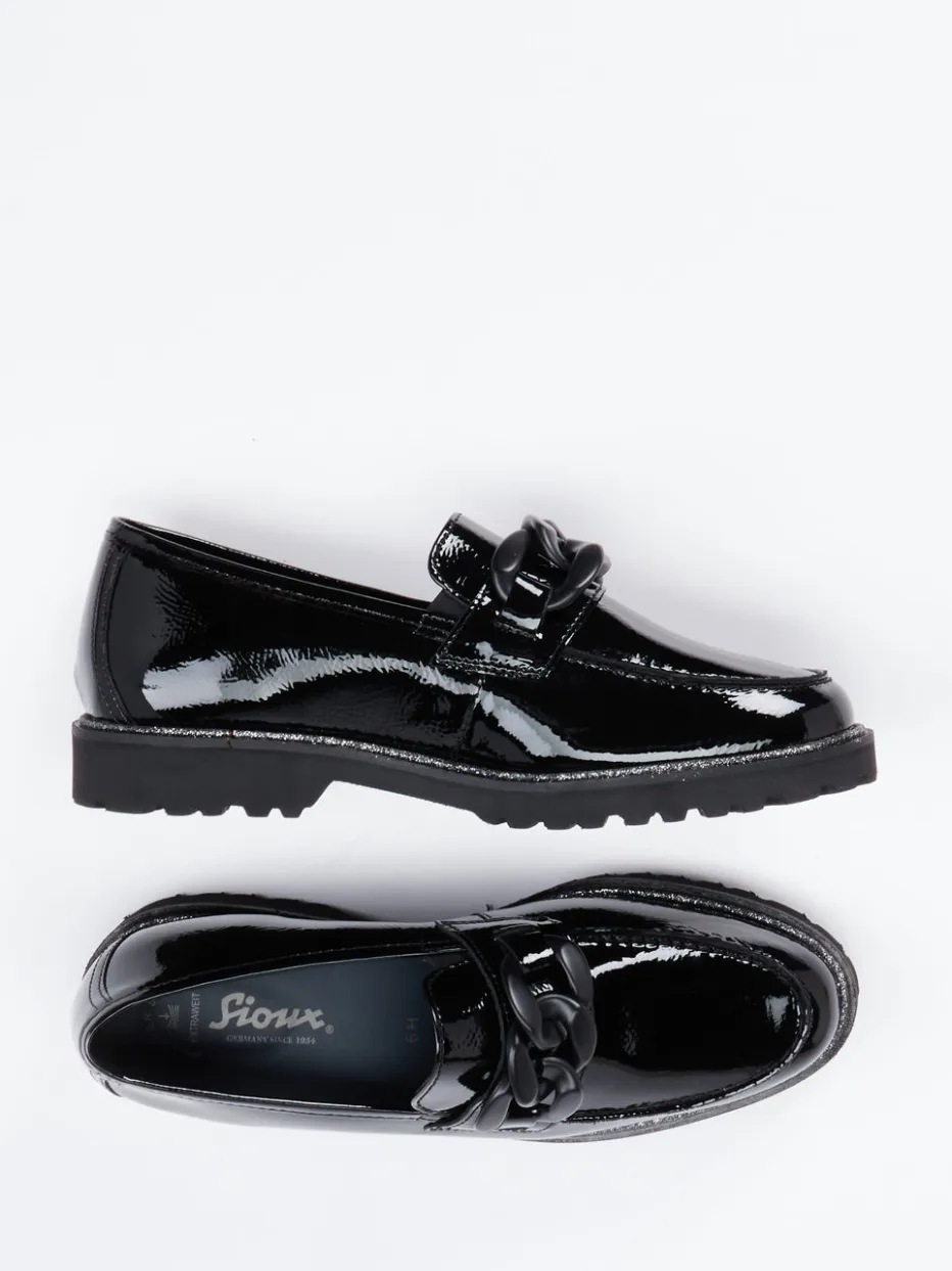 Statement in Lack und Profil.Die Marke Sioux präsentiert mit diesem Loafer ein Modell, das Moderne und Klassik vereint. Ob im Büro oder urban unterwegs – der Damen-Loafer aus schwarzem Lackleder überzeugt mit glänzender Oberfläche und elegantem Schlupfschnitt. Die tonal abgestimmte Kunststoffkette und sichtbare Mokassinnähte ergänzen die klassische Silhouette mit dezentem Statement-Charakter. Die Gummisohle mit profilierter Struktur bietet rutschhemmende Eigenschaften, das Innenfutter aus Leder-/Textil-Mix sowie das gepolsterte Wechselfußbett sorgen für spürbaren Komfort. Im Stil zwischen „Quiet Luxury“ und Streetwear schafft dieses Modell die Verbindung von Trendbewusstsein und Funktion. Ein komfortabler Blickfang mit Premium-Charakter – speziell für stilvolle Alltagsmomente.