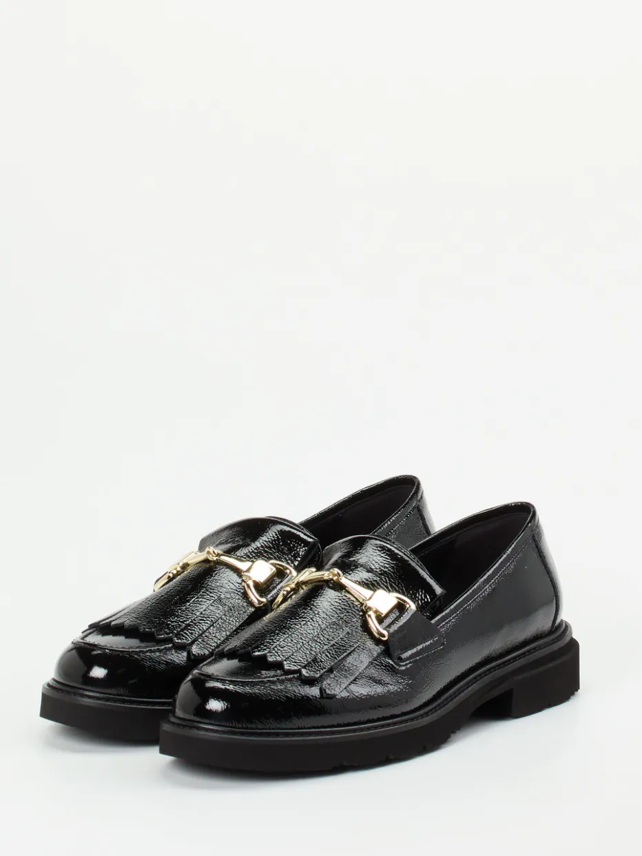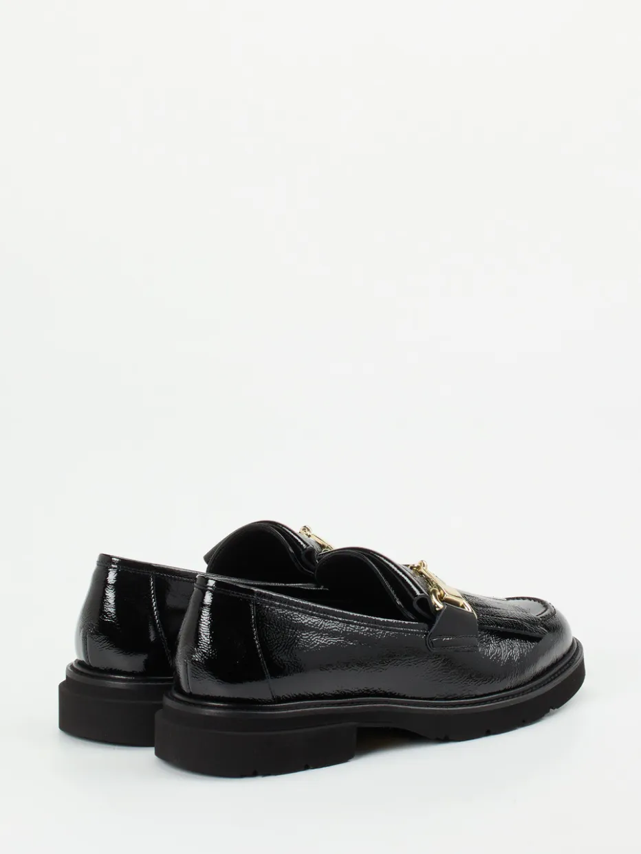 Klassischer Chic trifft auf zeitgemäße Eleganz: Lackleder und goldene Spange verleihen diesem Loafer einen edlen Auftritt – ideal für Büro und Freizeit.