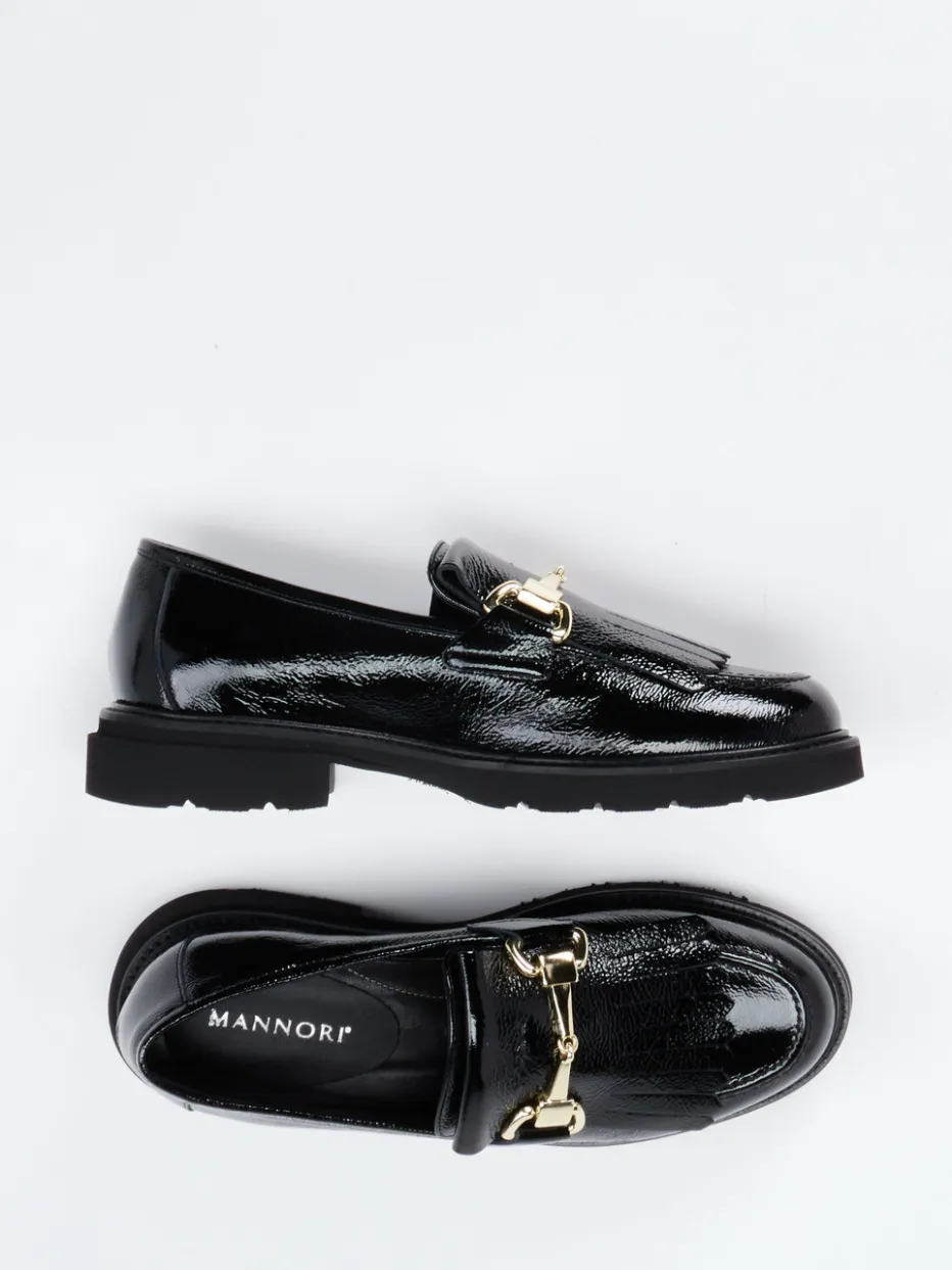 Glanz trifft auf Statement-Design.Der Loafer von Mannori vereint modische Raffinesse mit hohem Tragekomfort. Für alle, die stilbewusst durchs Office oder die City gehen möchten: Das schwarze Hochglanz-Lackleder ist formstabil und edel verarbeitet. Zierfransen und die goldfarbene Trensenspange setzen markante Akzente auf der klassischen, flachen Silhouette. Die leichte, betont profilierte Leichtzellsohle sorgt für Trittsicherheit bei urbanen Wegen und greift den Chunky-Loafer-Trend der Saison auf. Lässt sich perfekt mit Blazer und Ledertasche kombinieren. Vielseitiger Stilpartner mit klarer Formsprache und minimalistischem Preppy-Charme.