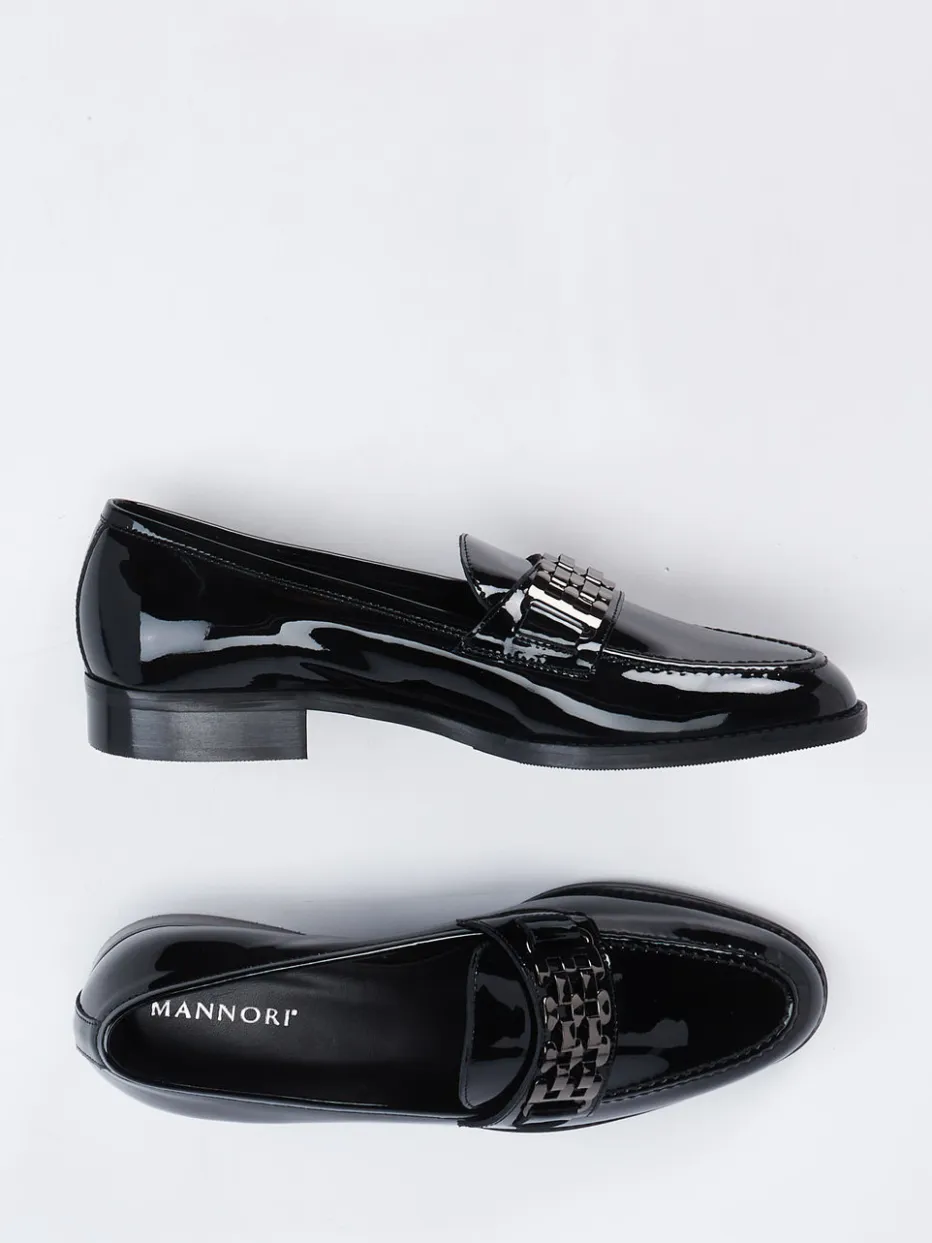 Dieser schwarze Loafer von Mannori zeigt, wie glänzendes Lackleder und ein edles Kettendetail minimalistische Eleganz verkörpern. Ein moderner Klassiker für vielseitige Looks.