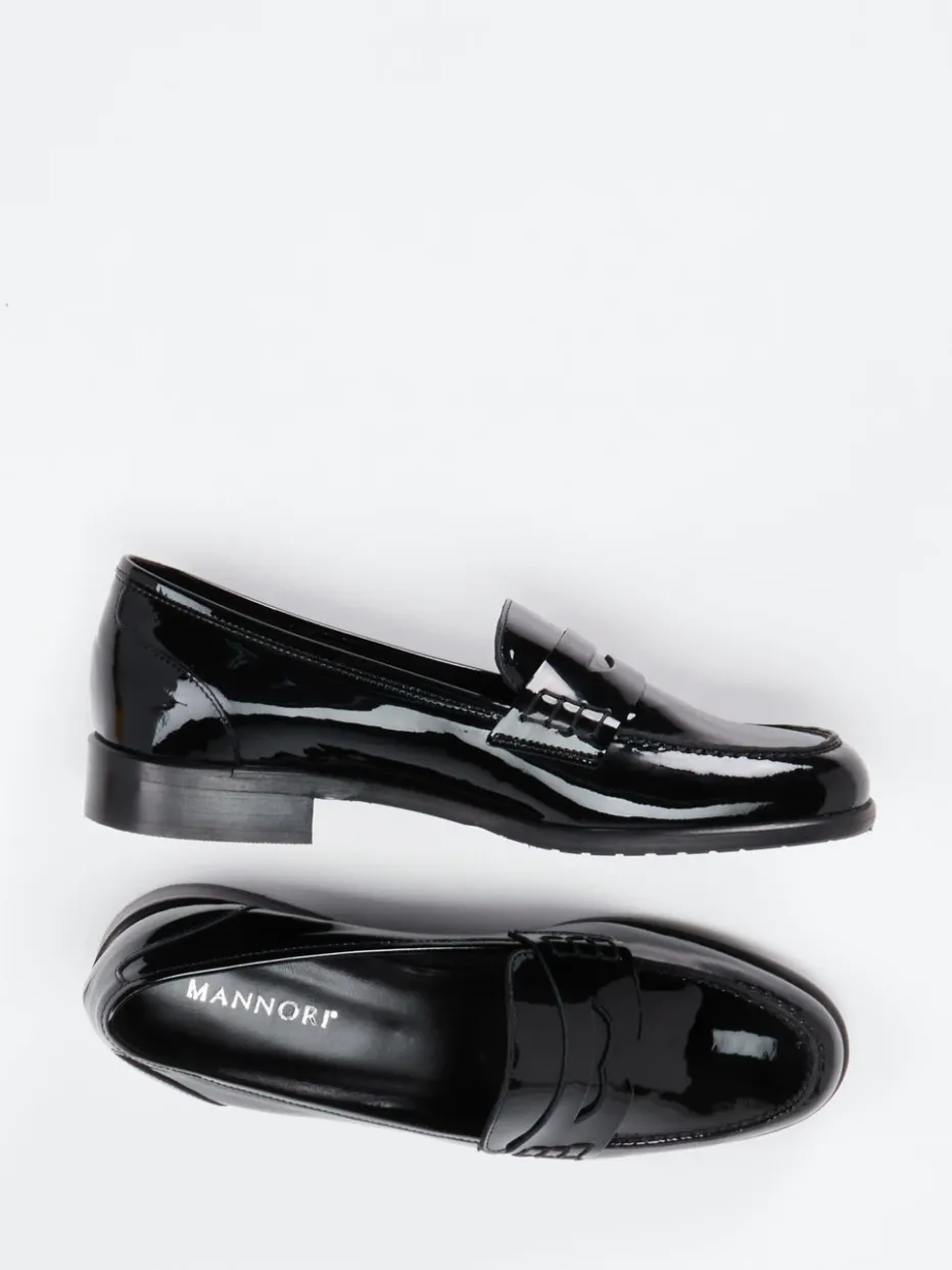 Glanzvoll gerüstet für stylische Auftritte.Mannori präsentiert mit diesem Damen-Loafer ein Modell der zeitlosen Klassiker. Ideal für strukturierte Alltagslooks im Büro oder stilvoll kombinierte Freizeitgarderobe: Das Modell überzeugt durch schwarzes Lackleder mit Hochglanz-Finish. Die klassische Silhouette mit Penny-Zunge und tonigen Nähten unterstreicht den dezenten Preppy Chic. Innen verwöhnt weiches Ziegenlederfutter mit angenehmem Komfort, ergänzt durch ein leicht gepolstertes Fußbett. Die rutschhemmende Profilsohle sorgt für Stabilität ohne Einbußen in der Eleganz. Ein Schuh, der den Trend „Quiet Luxury“ dezent interpretiert und sich vielseitig stylen lässt – etwa mit einer schwarzen Ledertasche oder klassischen Stoffhose. Ein markentypisches Statement für feminine Individualität mit Understatement.