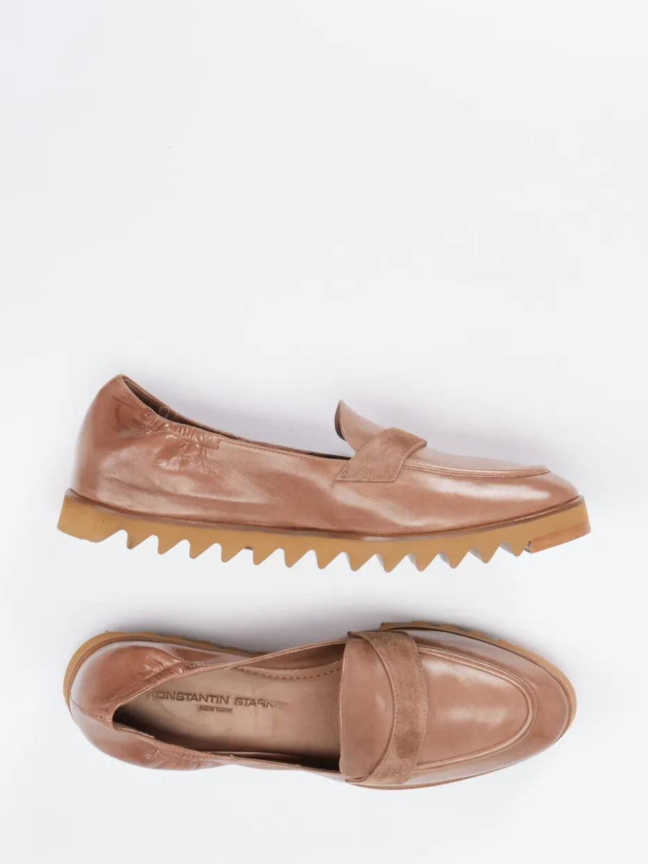 Formvollendet mit feinen Kontrasten.Der Damen-Loafer von Konstantin Starke vereint klassische Eleganz mit modernem Komfort. Ideal bei längeren Tagen zwischen Büro und Freizeit bietet das Modell weiches, glänzendes Lammleder, ergänzt durch eine tonale Veloursleder-Bride auf dem Blatt. Die mittelfarbige Erscheinung in Karamell-Mittelbraun verleiht ihm einen zeitgemäßen Look, während die flache Silhouette, elastische Fersenpartie und eine robuste Vibram-Gummisohle mit markantem Zahnprofil für besten Halt sorgen. Minimalistische Linien und dezente Materialien spiegeln den Trend zu Quiet Luxury wider. Leicht kombinierbar mit Trenchcoat oder Ledertasche in Naturtönen. Qualität und Design vereint in einem kompromisslos stilvollen Auftritt.