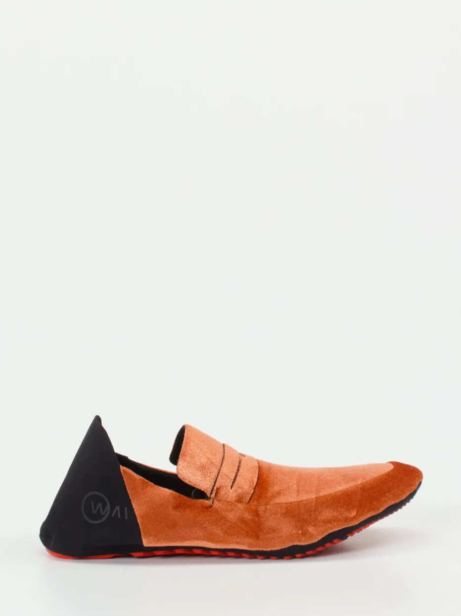 Flexibler Style trifft samtige Struktur.Die italienische Marke Wai präsentiert mit diesem flach geschnittenen Loafer aus Textil einen innovativen Hausschuh für urbane Stiltypen. Ideal für entspannte Stunden zuhause oder legere City-Looks – das Modell punktet mit elastischer Fersenkappe, nahtloser Passform und auffälliger Farbe in Kupferorange. Der samtig anmutende Velours-Look unterstreicht den unkonventionellen Appeal. Die profilierte, kontrastierende Gummisohle sorgt für Halt und visuelle Dynamik. Die spitz zulaufende Silhouette betont den minimalistischen Ansatz und spielt mit aktuellen Trends wie Velvet Revival und Color-Blocking. Perfekt zu Jogpants oder Oversized Pieces kombinierbar. Ein Statement-Schuh, der Leichtigkeit und Designbewusstsein vereint.