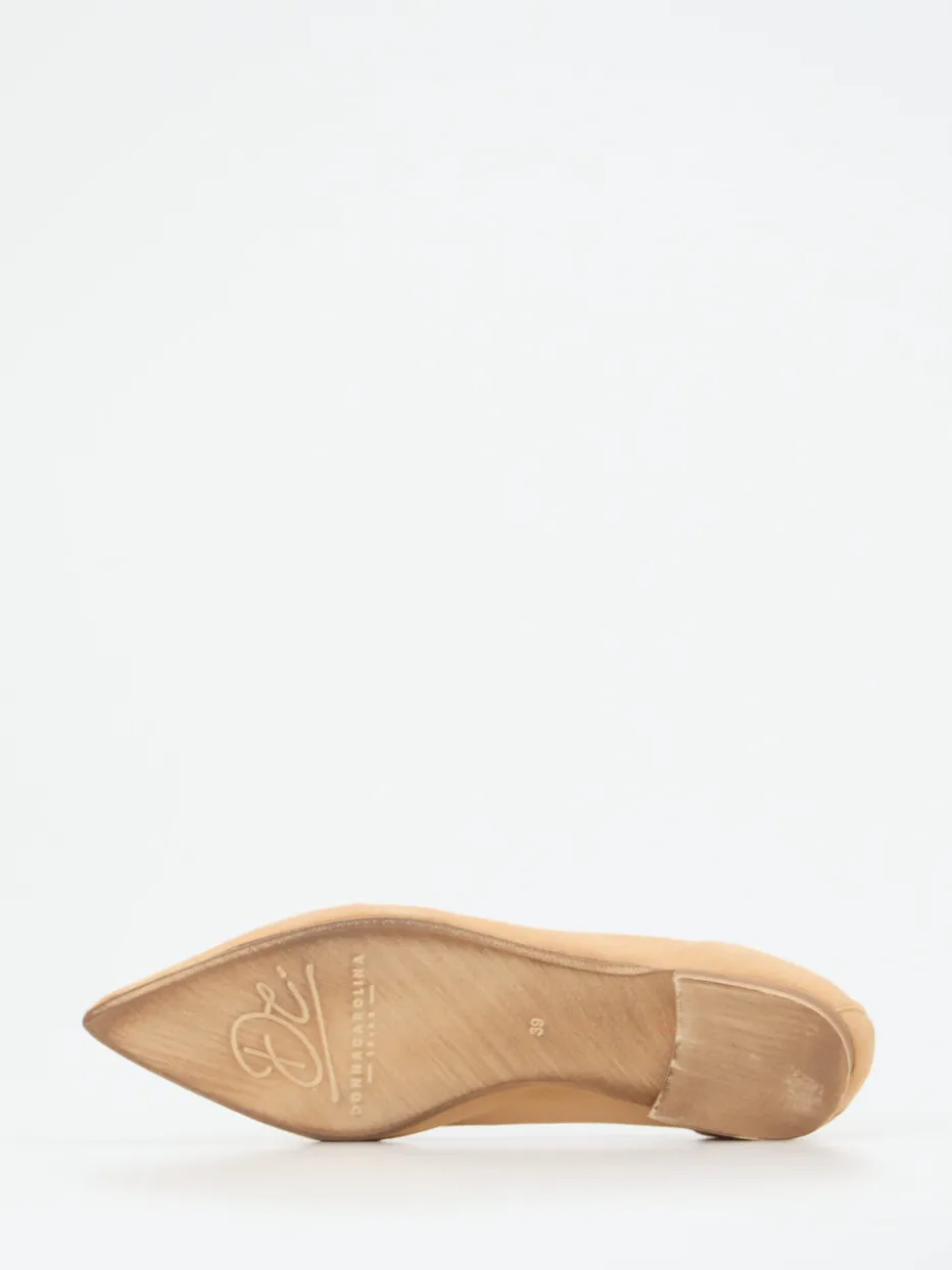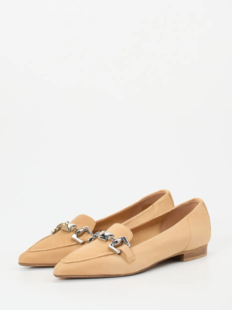 Stilvoller Minimalismus mit Glanzakzent.Donna Carolina präsentiert mit diesem Loafer ein elegantes Modell für Damen, das in hellbraunem Veloursleder gefertigt ist. Die samtig-matte Oberfläche und die spitz zulaufende Silhouette passen ideal zu minimalistischen Looks. Markant: Die feine Metallkette in Gold- und Silberoptik, inspiriert vom „Mixed Metals“-Trend der Saison. Dank Schlupfdesign und flachem 1,5 cm Absatz bietet der Schuh Komfort für Büro und Alltag. Die ungefütterte Verarbeitung schmiegt sich angenehm an den Fuß, während die feine Mokassinnaht das Design abrundet. Am besten kombinierbar mit weiten Hosen und monochromen Outfits. Ein femininer Klassiker mit modernem Akzent – typisch Donna Carolina.