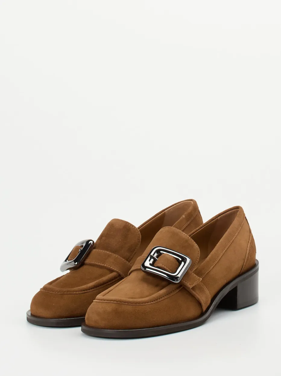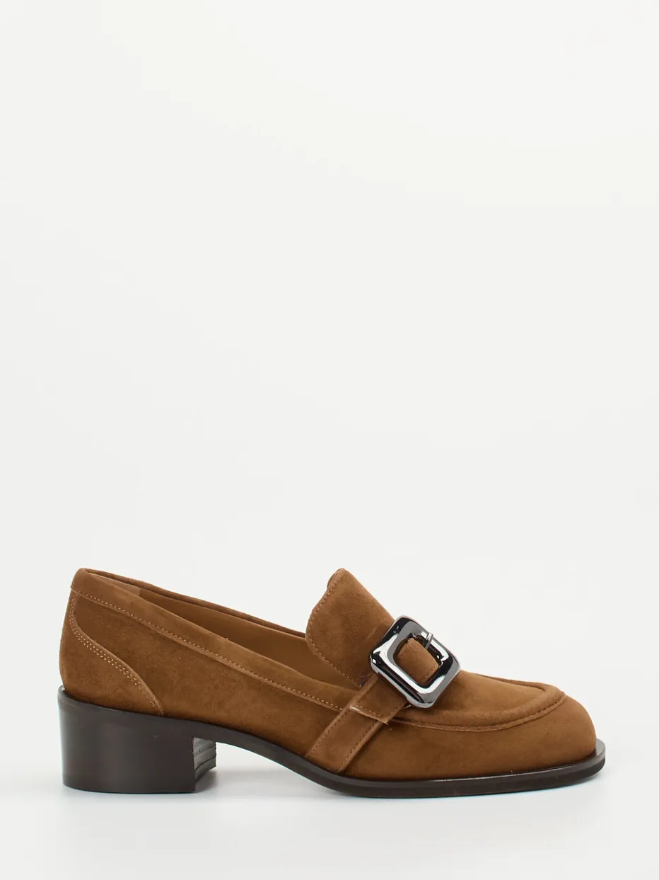 Herbstlicher Chic neu interpretiert.Andrea Puccini präsentiert einen eleganten Damenloafer, der Klassiker und Trend mühelos vereint. Ideal für Büro oder Citywalk verbindet dieses Modell hochwertiges Veloursleder mit einer samtigen Haptik in warmem Cognacbraun. Die geschwungene Silhouette mit handwerklicher Mokassinnaht trifft auf eine silberfarbene Metallschnalle als stilvolles Detail. Ein stabiler Blockabsatz in Holzoptik sorgt für komfortable 3,5 cm Laufhöhe. Durch das gepolsterte Lederfußbett entsteht angenehmer Tragekomfort. „Quiet Luxury“ kommt hier mit feinen Linien und subtiler Raffinesse ins Spiel. Passt perfekt zu Trenchcoat oder Lederaccessoires. Authentische Ästhetik und Qualität – typisch Andrea Puccini.