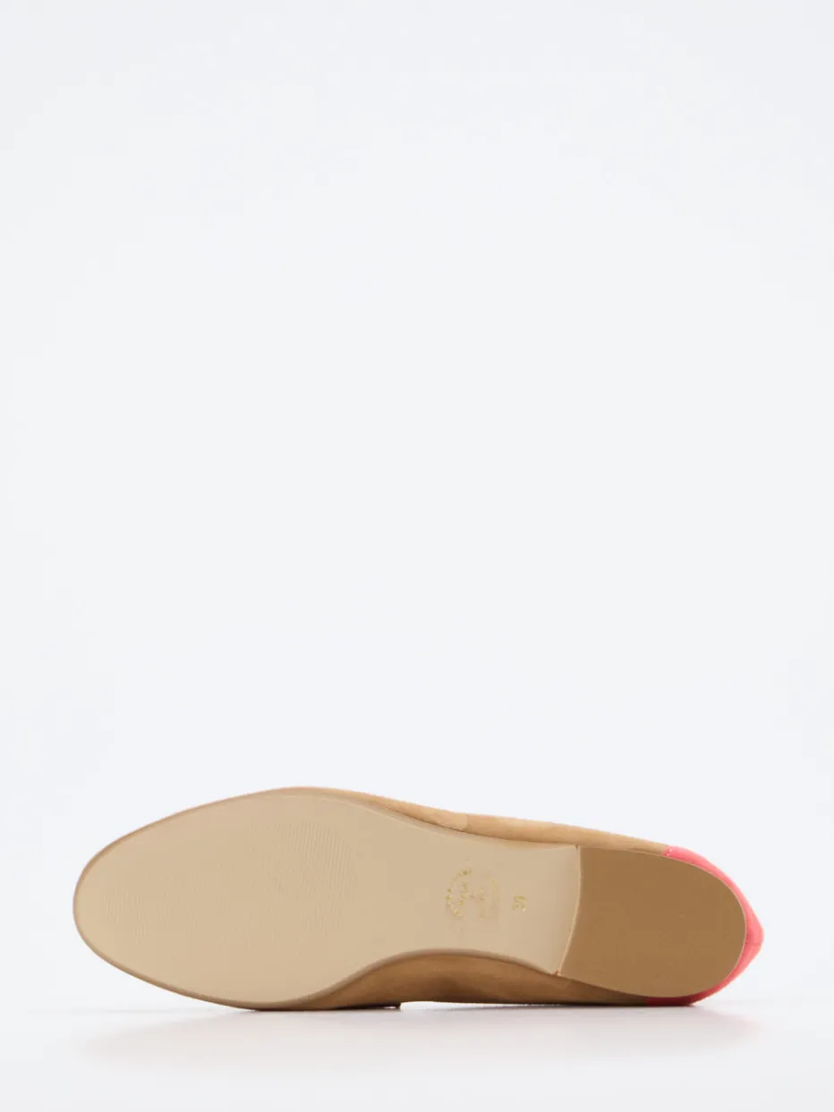 Frische Akzente für warme Tage.Andrea Puccini präsentiert einen stilvollen Damen-Loafer für Alltag und Urlaub. Samtig weiches Veloursleder in Cognac-Beige kombiniert mit auffälligen Applikationen in Koralle und Grasgrün verleiht diesem Modell sommerliche Frische. Die klassische flache Silhouette, Zierlasche und grüne Kontrastpaspelierung sorgen für einen preppy Look mit Retro-Charme. Der Loafer lässt sich unkompliziert hineinschlüpfen und wirkt durch den dezenten Blockabsatz zugleich bequem wie feminin. Im Kontext aktueller Color-Blocking-Trends ideal zu Leinentaschen oder farblich abgestimmten Sommerkleidern tragbar. Trendiger Komfort mit mediterranem Flair – typisch Andrea Puccini.