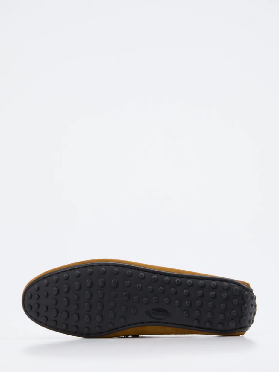 Ideal für Büro und Alltag, überzeugt dieses Modell durch cognacbraunes Veloursleder mit samtiger Oberfläche, eine flache Silhouette und tonige Ziernähte. Typisch Tod’s sorgt die schwarze Gummisohle mit ikonischem Noppenprofil für exzellenten Halt. Die geprägte Logo-Applikation auf dem Blatt sowie die geschwungene Pennybridge unterstreichen das zurückhaltend-luxuriöse Design. Perfekt zu Chinos oder Anzughosen – ein Statement des „Quiet Luxury“-Trends.